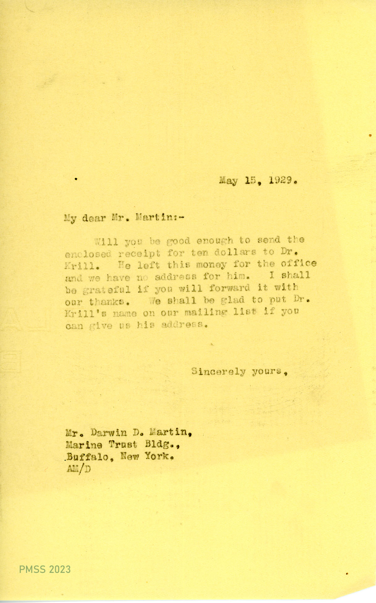 026 May 15, 1929. To Martin from AM [Melville], asking him to forward the enclosed $10 receipt to Dr. Krill, who “left this money for the office.” She also asks for Krill’s address to add to the School’s mailing list.