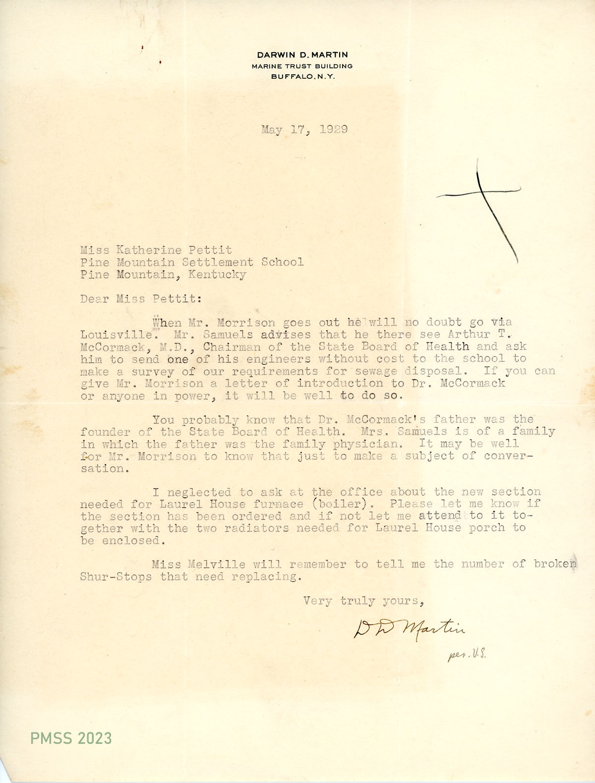 029 May 17, 2025. To Pettit from Martin, asking if Mr. Morrison will meet with Arthur T. McCormack, M.D., Chairman of the State Board of Health in Louisville, to request an engineer “without cost to the school to make a survey of our requirements for sewage disposal.” He informs Pettit that “Dr. McCormack’s father was the founder of the State Board of Health and Mrs. Samuels is of a family in which the father was the family physician,” facts that Morrison can use as talking points. He asks about progress on ordering “the new section needed for Laurel House furnace (boiler).” He offered to order it along with “the two radiators for Laurel House porch to be enclosed. He asks how many Shur-Stop replacements are needed.