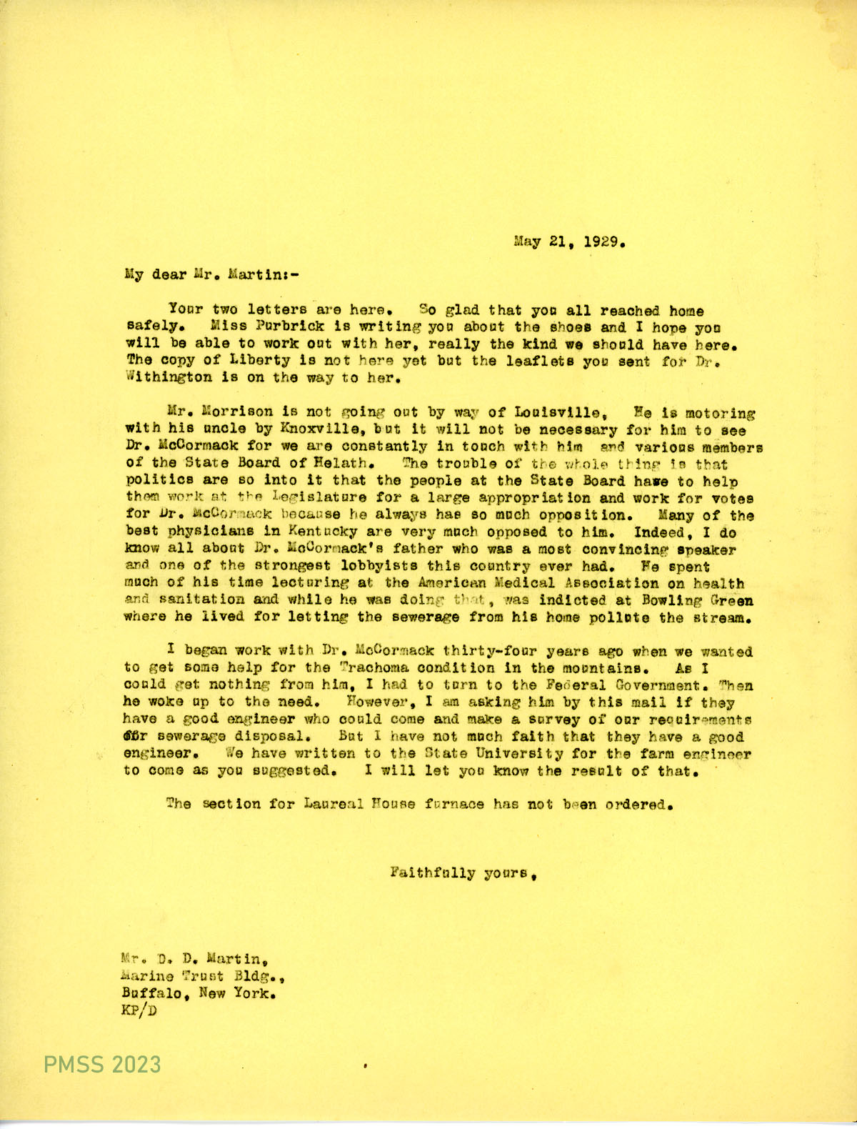 030 May 21, 1929. To Martin from KP [Pettit], referring him to Miss [Marian] Purbrick about the shoes. Mentions that Mr. Morrison won’t be meeting with McCormack. She provides details about McCormack and his father. She is currently asking him if they have a good engineer, which she doubts. At his suggestion, she has also written to the State University for a farm engineer. “The section for Laurel House furnace has not been ordered.”
