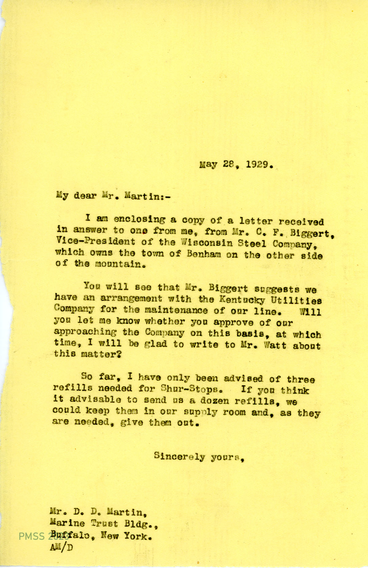 032 May 28, 1929. To Martin from AM [Melville], To Martin from AM [Melville],enclosing a letter to her from “Mr. C.F. Biggert, Vice President of the Wisconsin Steel Company, which owns the town of Benham on the other side of the mountain.” Biggert suggests that PMSS arrange with the Kentucky Utilities Company for maintenance of PMSS’s power line. She asks Martin if he approves.