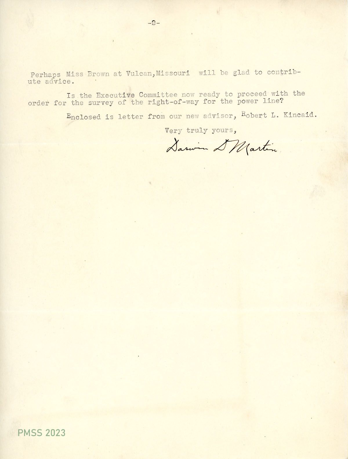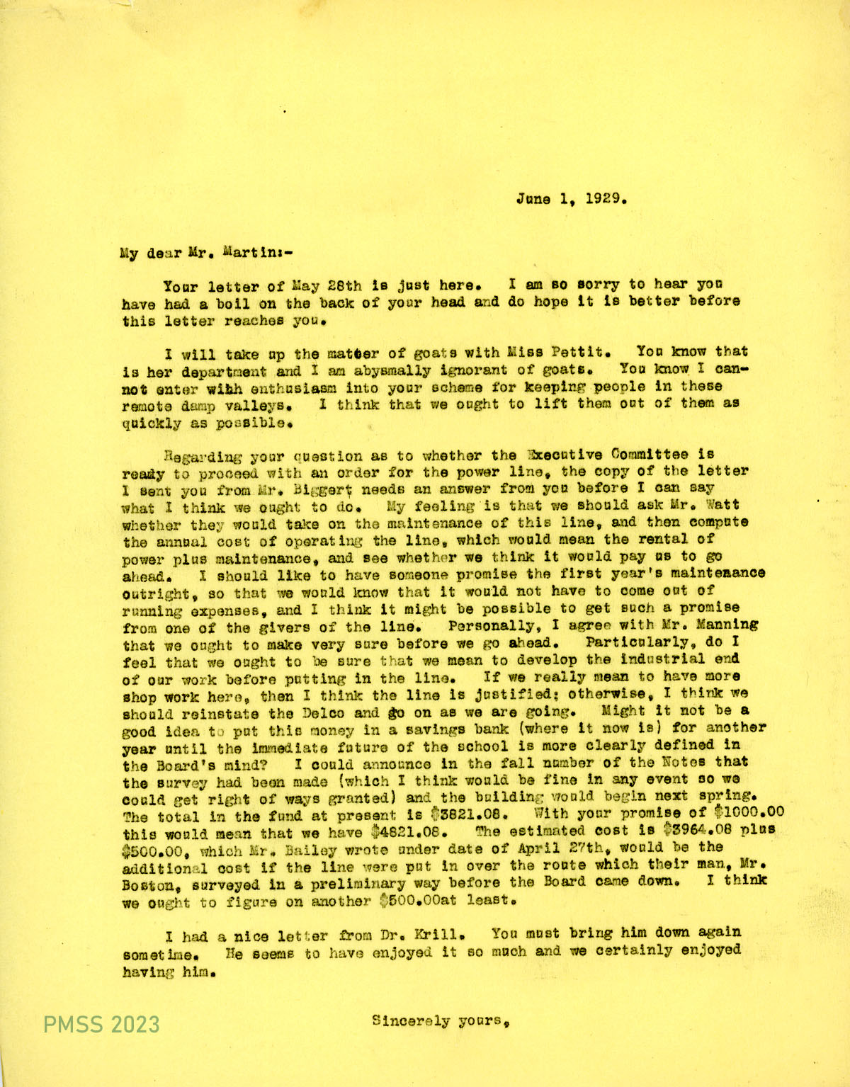 038 June 1, 1929. To Martin from [unsigned, apparently Melville] who will discuss his suggestions concerning goats with Pettit. She states her opinion about his “scheme for keeping people in these remote damp valleys. I think that we ought to lift them out of them as quickly as possible.” Responding to Martin’s question about “whether the Executive Committee is ready to proceed with an order for the power line,” she writes about maintenance of the line; whether to wait another year; the total amount in the fund plus Martin’s promise of $1,000; estimated cost of the line; and Mr. Boston’s preliminary survey. She received a “nice” letter from Dr. Krill and asks Martin to bring him to PMSS again.