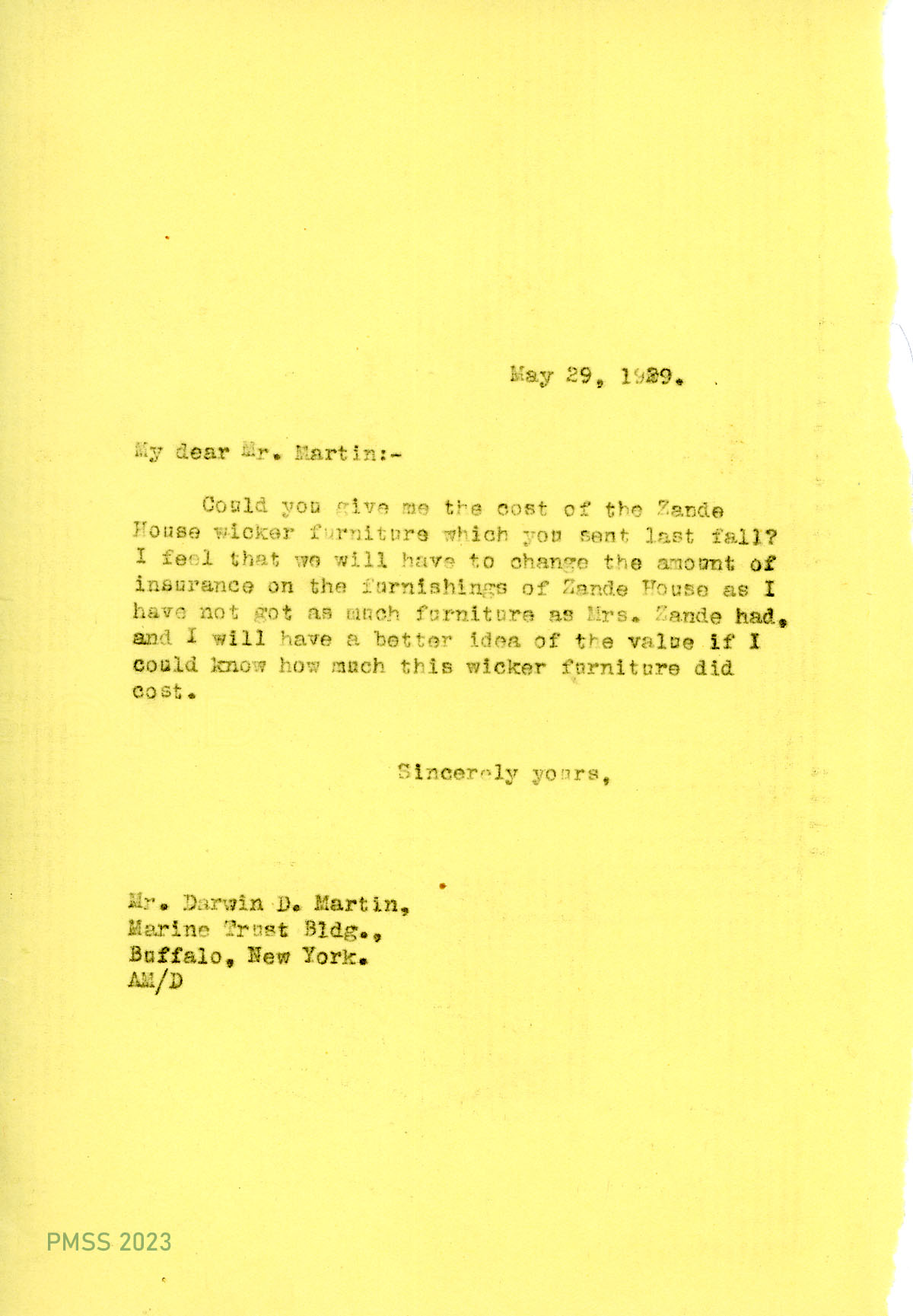 035 May 29, 1929. To Martin from AM [Melville], asking the cost of the Zande House wicker furniture that he had sent. She feels the amount of insurance on Zande House may have to be changed, as she has more furniture that Mrs. Zande had.