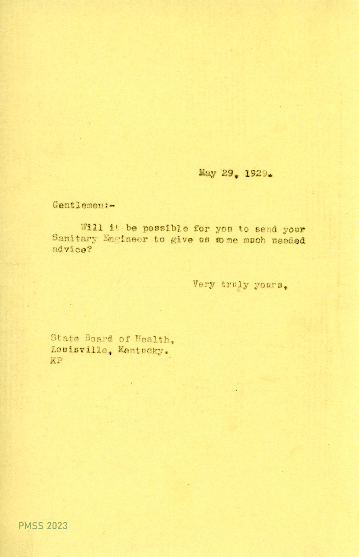 036 May 29, 1929. To “Gentlemen” at the State Board of Health, Louisville, KY, from KP [Pettit], asking for them to send their Sanitary Engineer to provide PMSS with “much needed advice.”