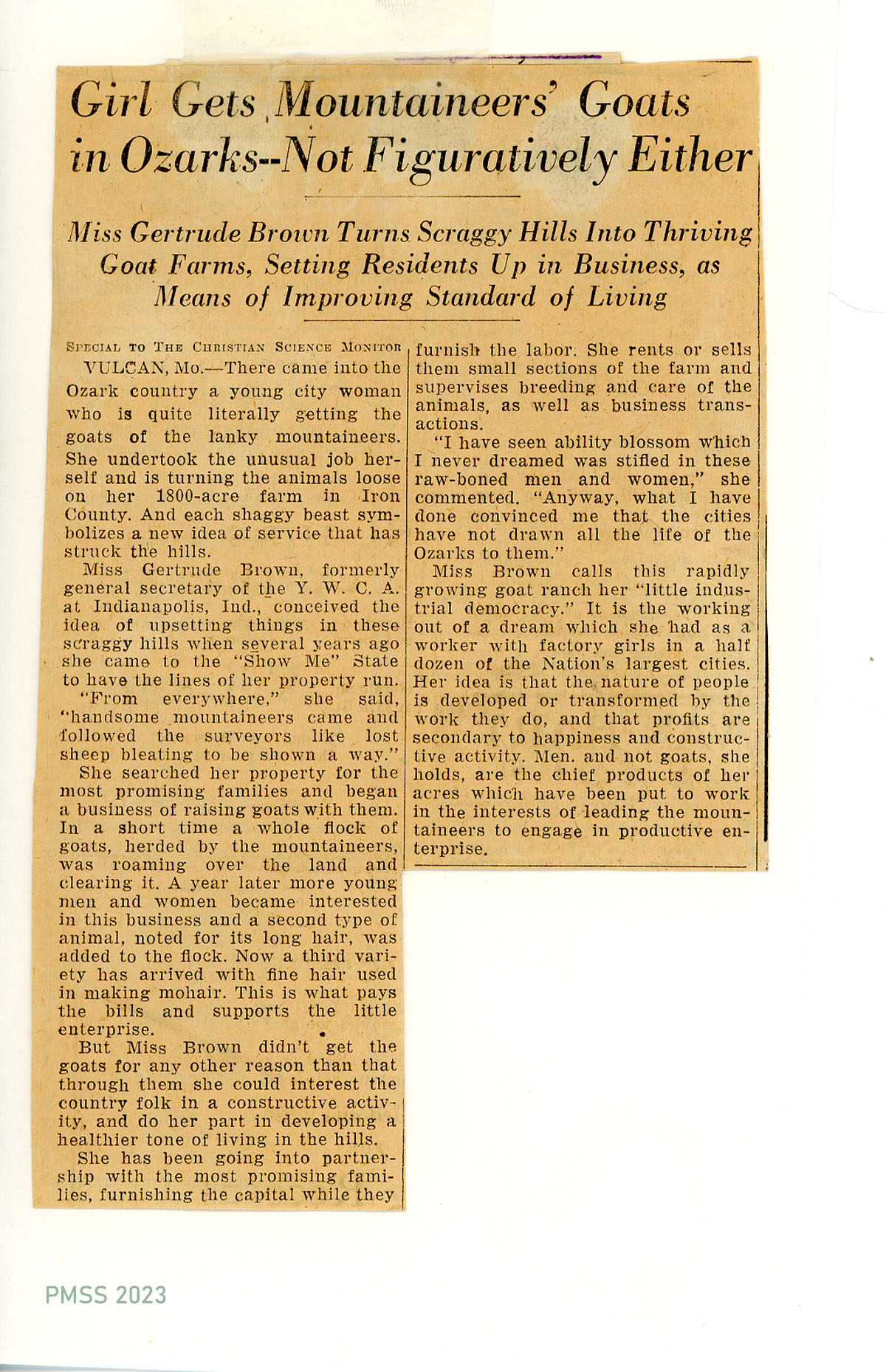 037 N.D. Newspaper article from The Christian Science Monitor, titled “… Miss Gertrude Brown Turns Scraggy Hills Into Thriving Goat Farms, Setting Residents Up in Business, as Means of Improving Standard of Living.”