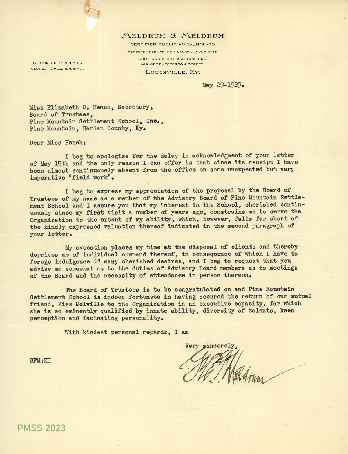 040 May 29, 1929 [Enclosed in Martin’s letter of June 20, 1929.] To Hench from George F. Meldrum, CPA, on letterhead for Meldrum & Meldrum, Louisville, KY. He has been interested in the School since his visit several years ago and asks about the duties of a member of the PMSS Advisory Board. He ends his letter by congratulating the Board for Melville’s return to PMSS as an executive and praising her qualifications.