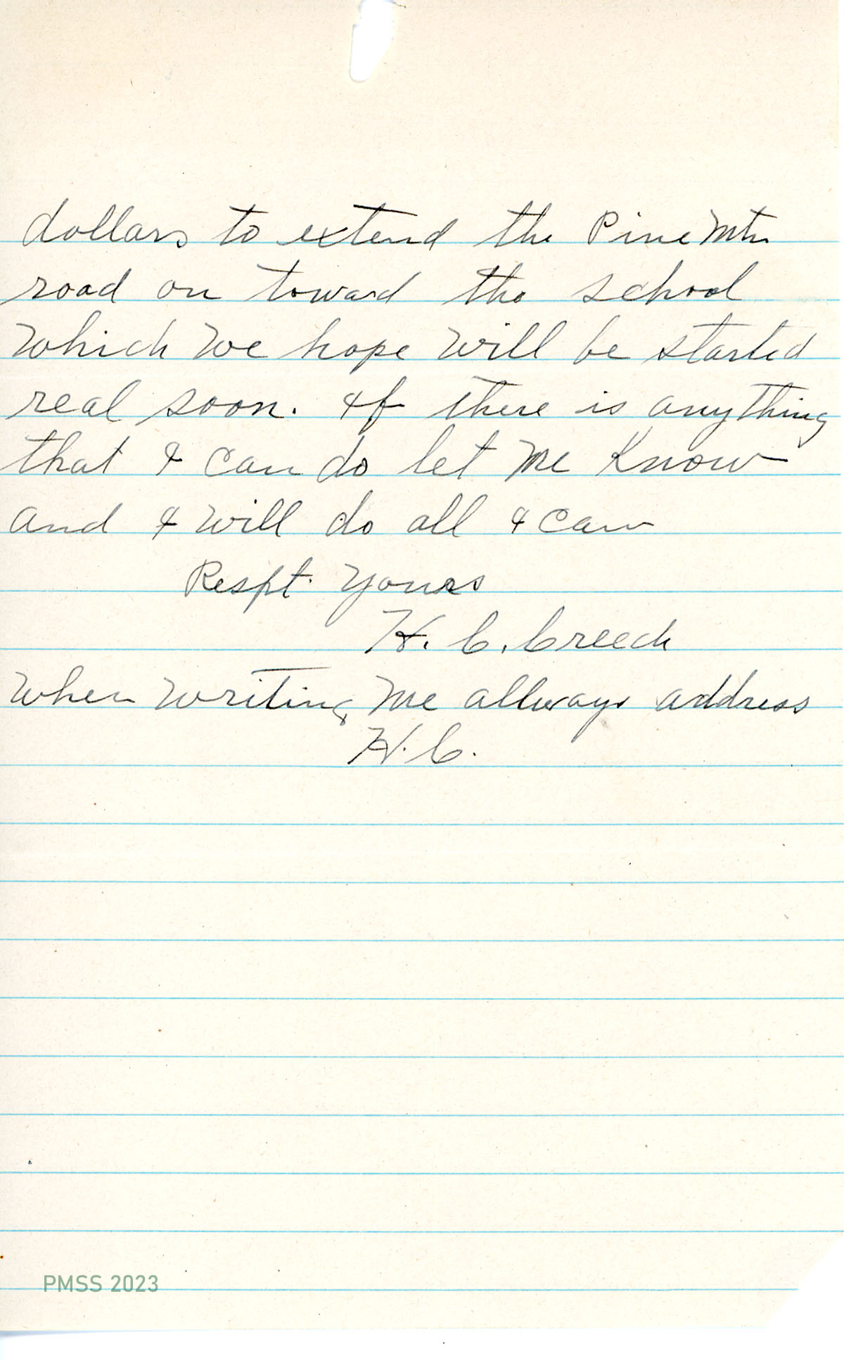 041-041a June 10, 1929. Handwritten two-page letter to Hench from H[enry] C. Creech, asking about “the duties of the General Advisory Board which seems like I have [been] chosen for a member. Now if this is something that I can do I will try to serve the school the best I can.” He mentions that “Harlan Fiscal Court appropriated fifty-thousand dollars to extend the Pine Mountain road toward the school.”