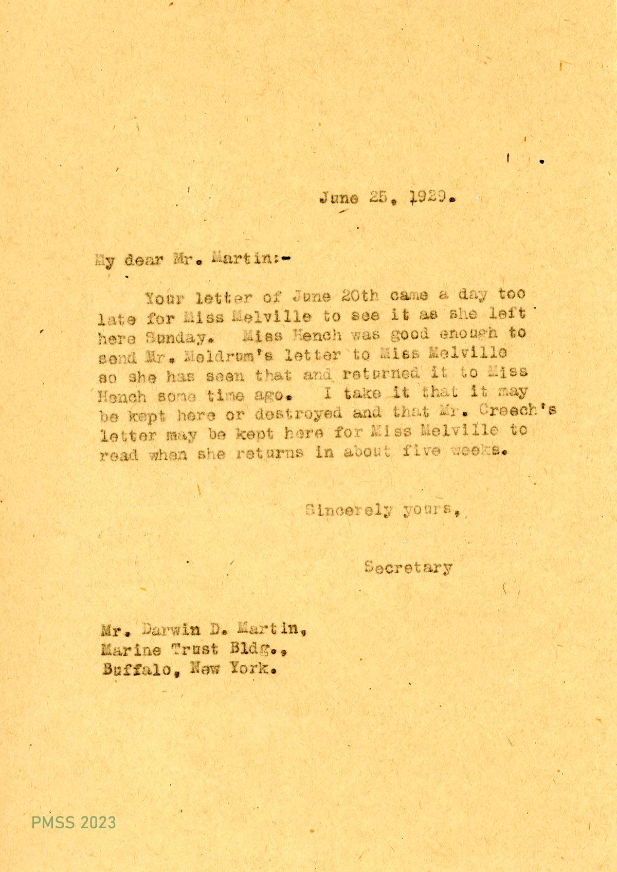 031 May 23, 1929. To Melville from Vera C. Skinner, Secretary, on Martin’s letterhead, sending Dr. Krill’s address in Buffalo, NY. [Melville’s handwritten notation in bottom margin asks Miss (Colette) Dunn(e) to put him on the mailing list.]