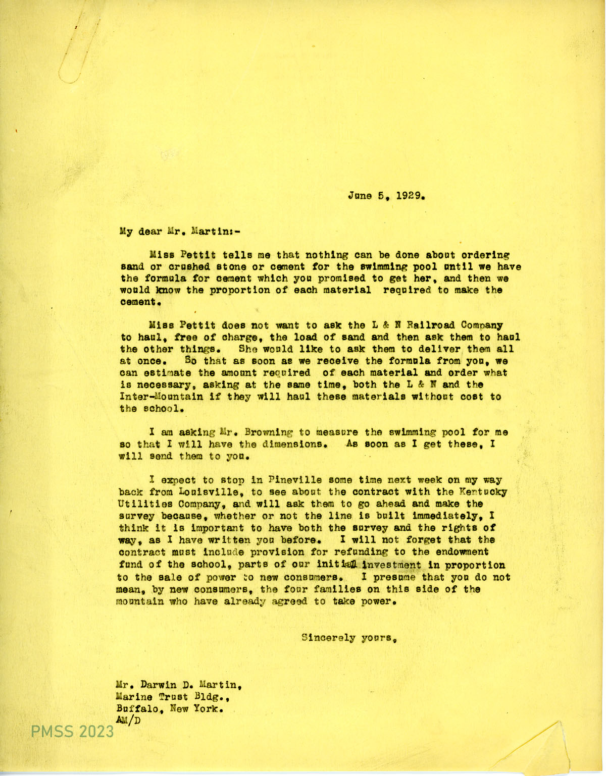 044 June 5, 1929. To Martin from AM [Melville], who tells him that, before ordering construction supplies, Pettit needs the “formula for cement” that he promised to send in order to estimate the amounts required. Melville also writes about Pettit’s preferred way to transport the supplies to the School. Melville plans to meet with the Kentucky Utilities Company in Pineville about the contract and starting the survey, adhering to Martin’s advice.
