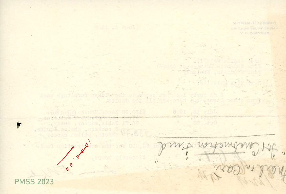 [Note: Letters from PMSS staff in the PMSS Collections are carbon copies, typewritten, unsigned, and meant for the Office files. The original signed documents were sent to the correspondents. The initials at the bottom left of most PMSS letters indicate the writer and secretary. Letters from Darwin D. Martin are typewritten originals on Larkin Company letterhead or his personal stationery. The following lists of contents are in chronological order and not necessarily in the order of image numbers.]