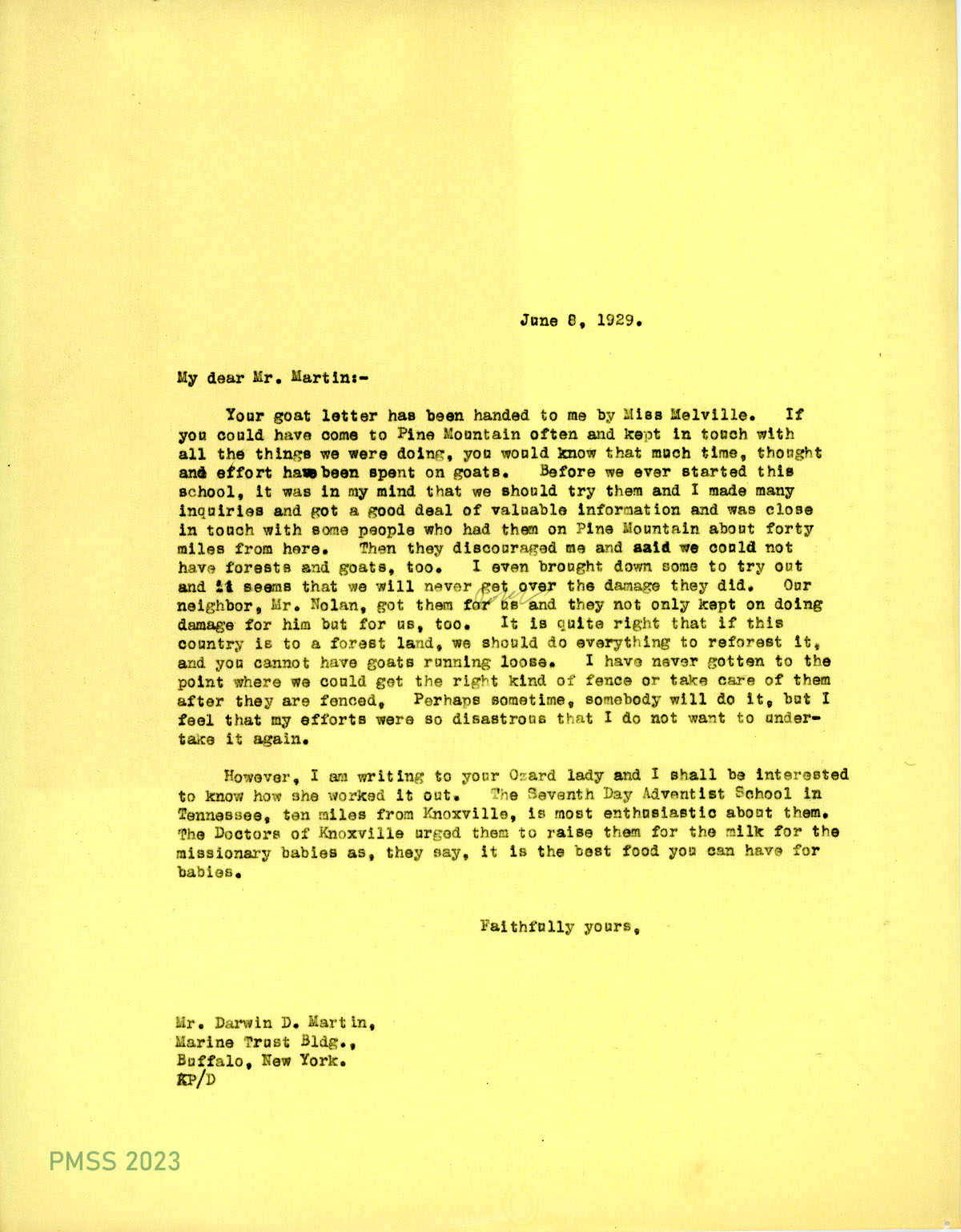 048 June 8, 1929. To Martin from KP [Pettit}, responding to his letter and her experiences concerning goats. She is writing to “your Ozard lady” asking how she works with goats. Pettit mentions the opinions of the Seventh Day Adventist School in Tennessee and the doctors of Knoxville concerning goats.