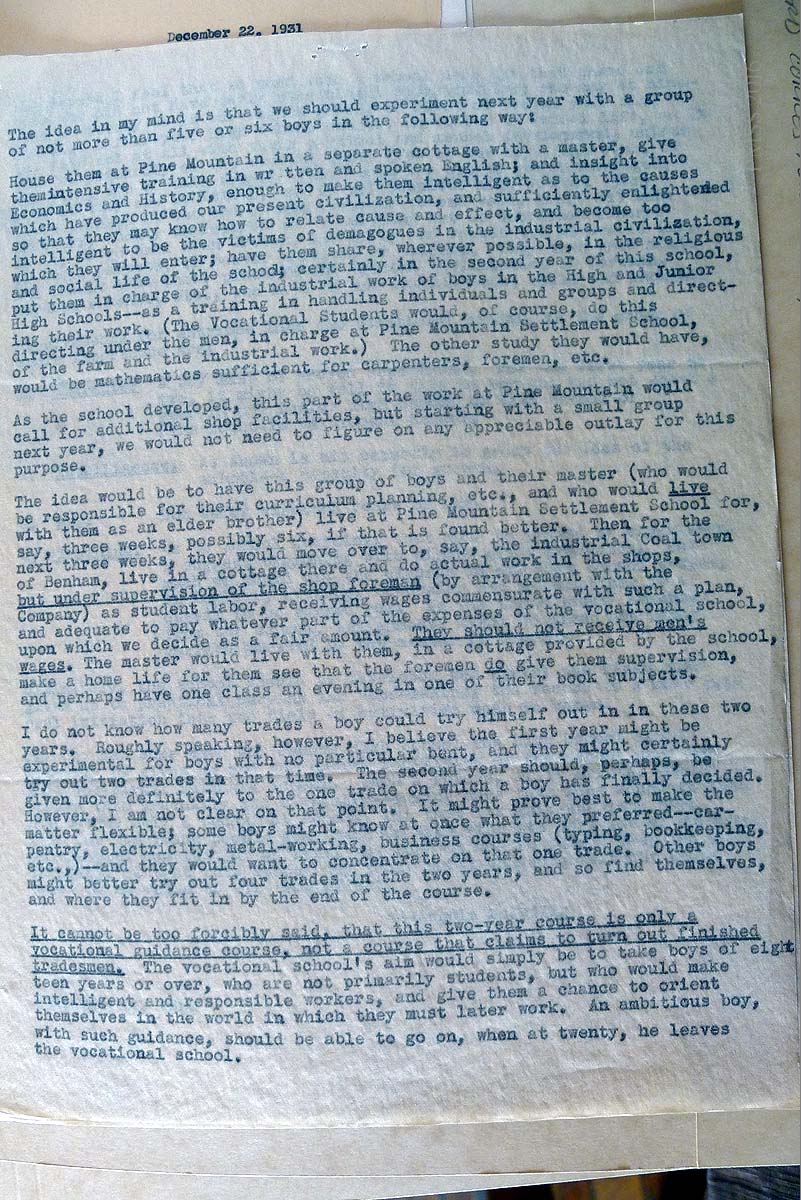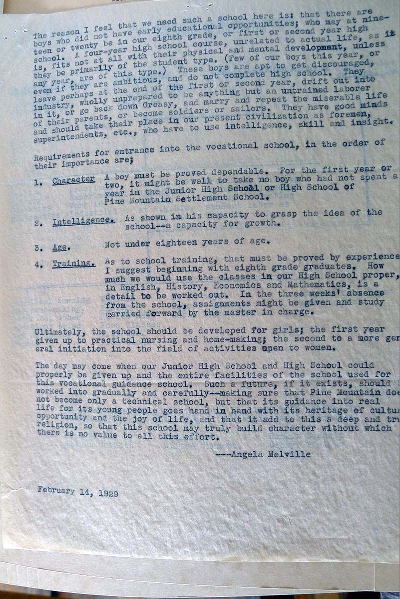 *Angela Melville’s memorandum with her suggestions for the School’s next two years, including providing intensive training – both vocational and “book subjects” – to five or six 18-year-old boys. It would be a work-study vocational guidance course to prepare them, at age 20, to function “in the industrial civilization which they will enter.” Melville gives reasons for the need of such a school and entrance requirements. Also, she states that “the school should be developed for girls,” providing training in nursing, home-making, and “general initiation into the field of activities open to women.” She ends by predicting a possible end to how PMSS’s High School would end and “the entire facilities of the school used for this vocational guidance school.” However, she warns that Pine Mountain should make sure that it does not become only a technical school, “but that its guidance into real life for its young people goes hand in hand with its heritage of cultural opportunity and the joy of life….and a deep and true religion,…so that this school may truly build character….”