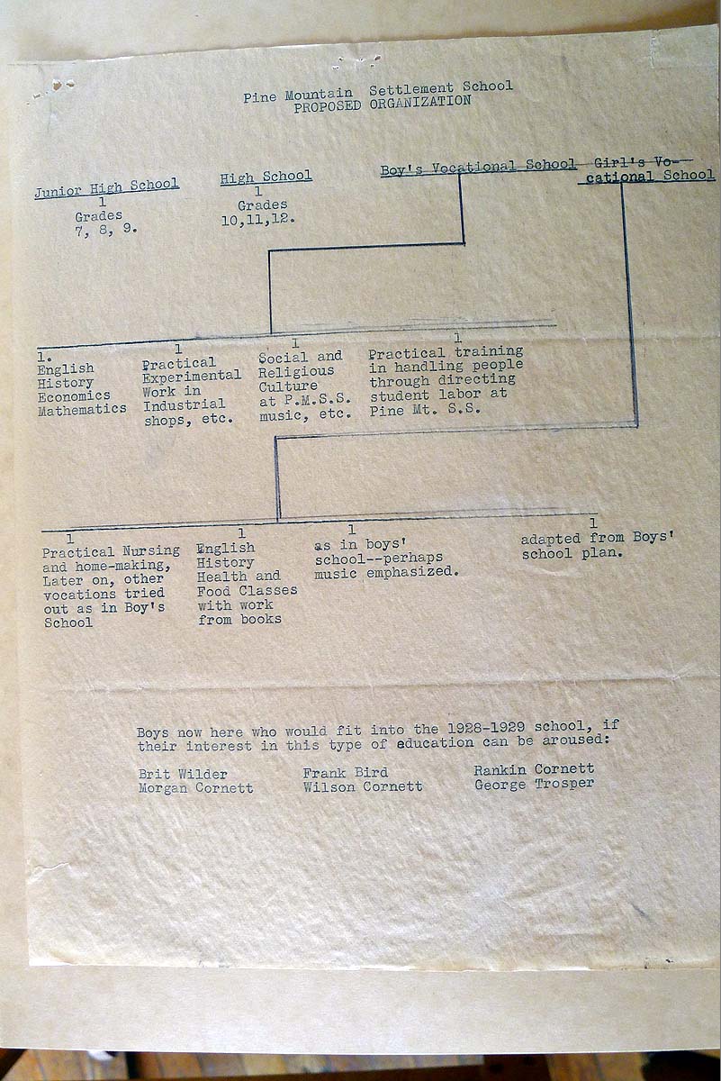 [Likely an addendum to Angela Melville’s memorandum of February 14, 1929.] The chart shows the curriculum for Boy’s Vocational School and Girl’s Vocational School. “Boys now here who would fit into the 1928-1929 school… – Brit Wilder, Morgan Cornett, Frank Bird, Wilson Cornett, Hankin Cornett, George Trosper.”