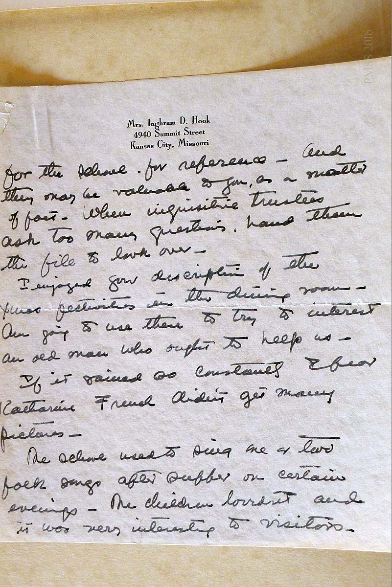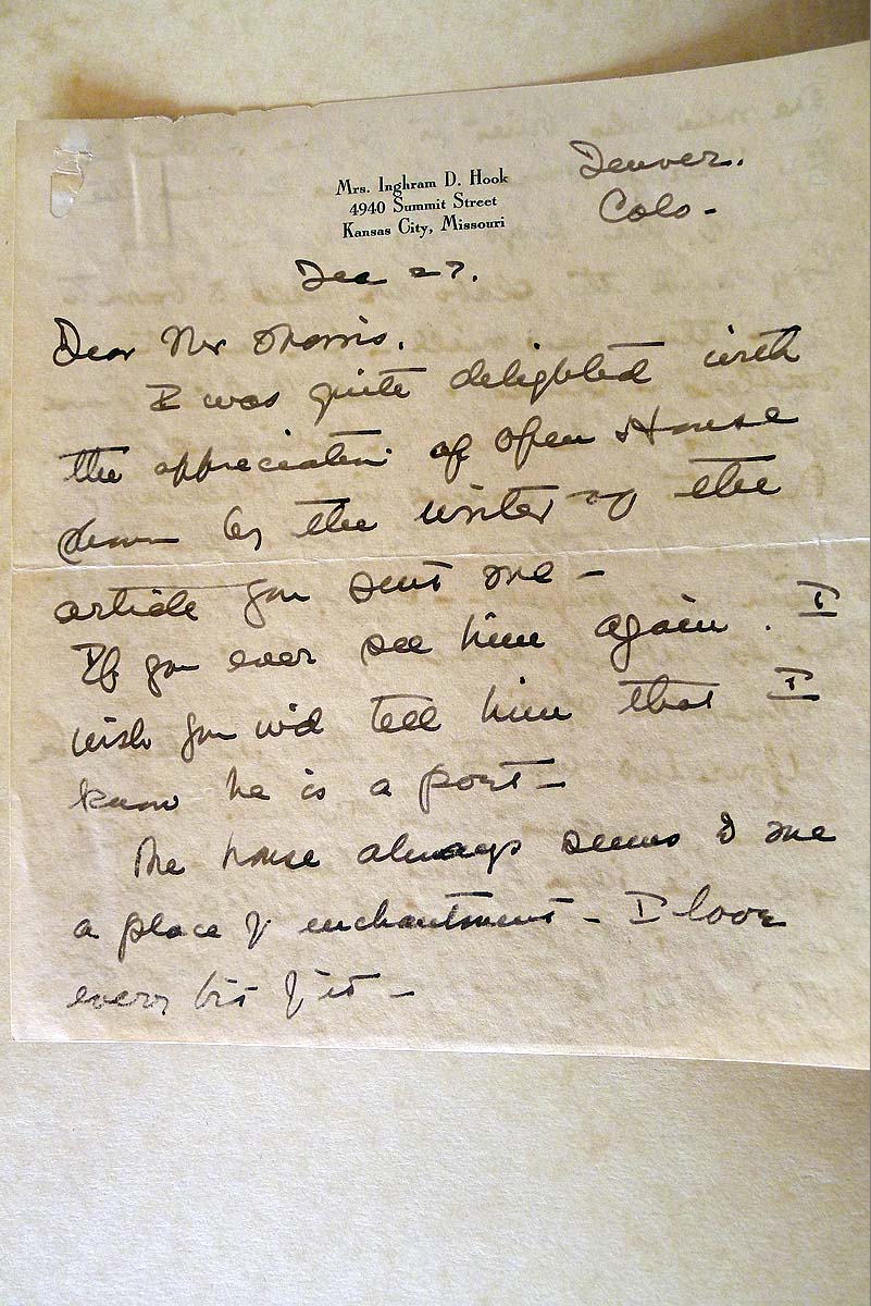 723 [P1050723] Handwritten Letter to Mr. [Glyn] Morris, December 27, [no year], from Mrs. Inghram D. (Mary Rockwell) Hook in Denver, Colorado. Hook is “delighted with the appreciation of Open House as shown by the writer of the article” she received. Hook wrote, “The house always seems to me a place of enchantment. I love every bit of it.” [unsigned – missing next page?]