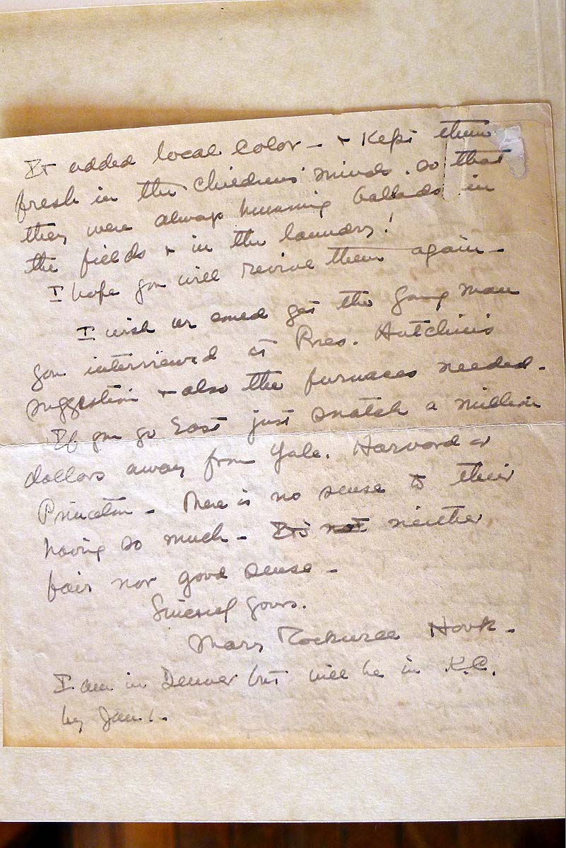 724, 725, 726 [P1050724, P1050725, P1050726] Three-page handwritten letter to [unknown] from Mrs. Inghram D. (Mary Rockwell) Hook. [n.d. – first page is missing.] Building the “Scrap House” from leftover logs and bark-covered slabs from Big Log, with Uncle William‘s supervision; praised two reports to the Trustees as valuable for the School & Board for reference; enjoyed descriptions of Xmas festivities; feared Catherine French didn’t get many pictures due to rain; cites advantages to reviving the tradition of singing folk songs after supper.