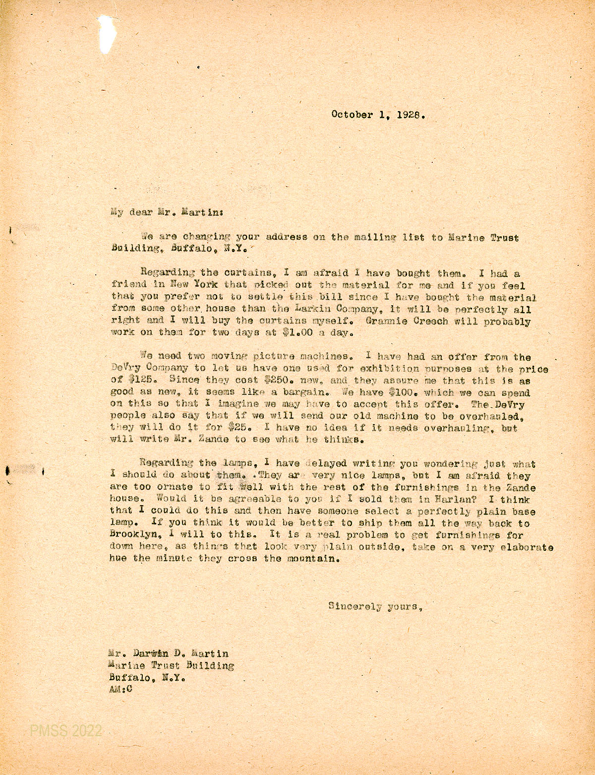 087 October 1, 1928. To Darwin D. Martin from AM [Angela Melville], responding to the questions in his September 26 letter about curtains, moving picture machines, and the lamps he sent, which she writes, are too “elaborate.” “It is a real problem to get furnishings for down here, as things that look very plain outside, take on a very elaborate hue the minute they cross the mountain.”
