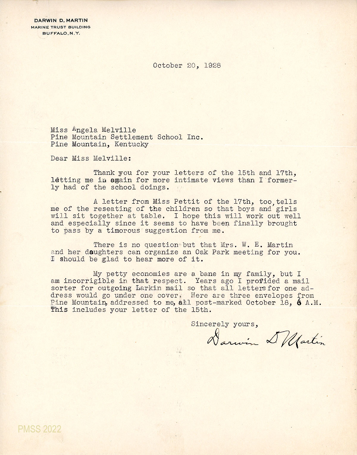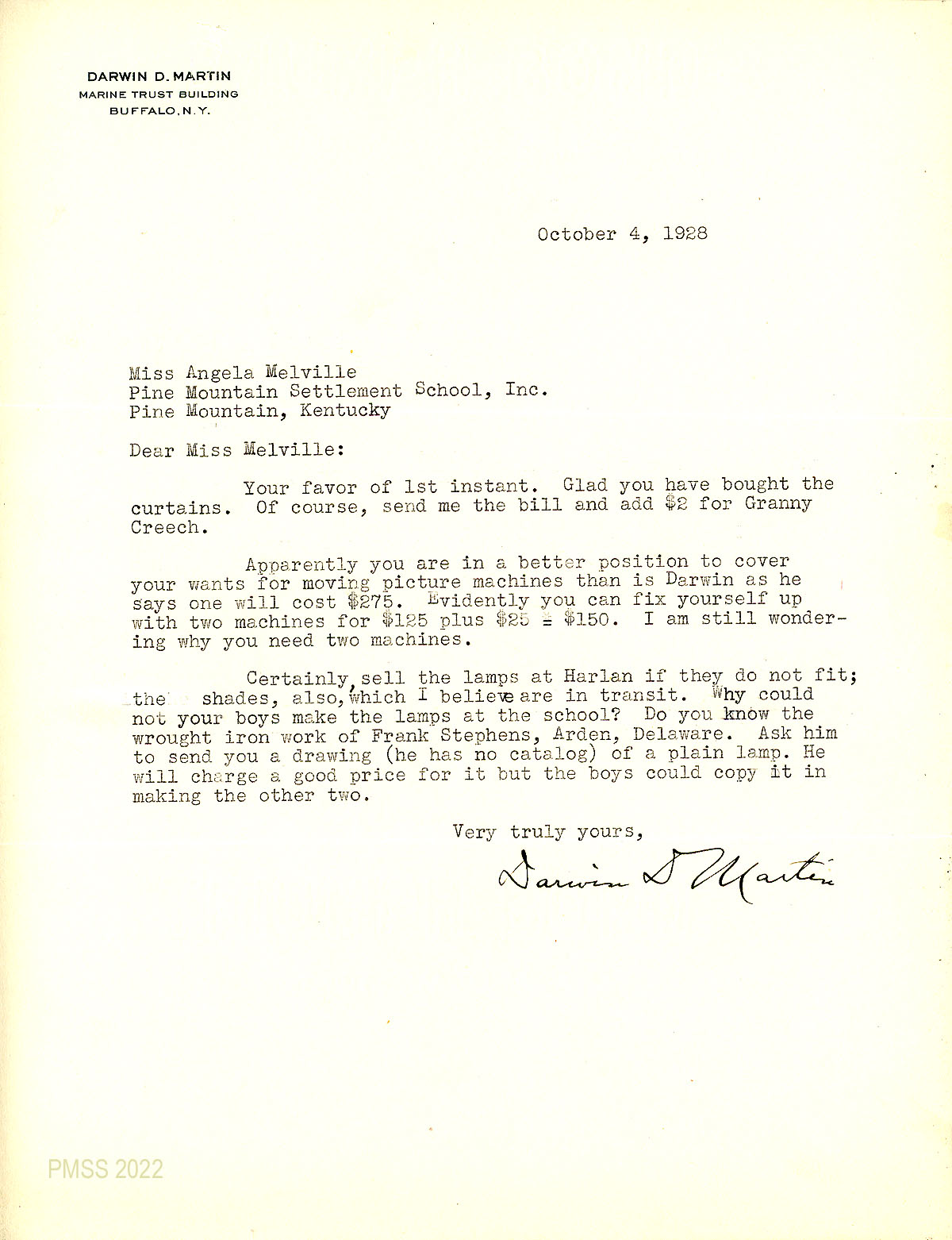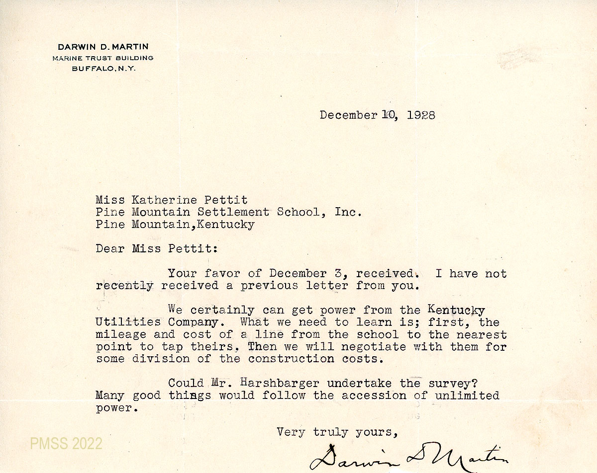 TAGS: Darwin D. Martin 1928 Correspondence, PMSS Board of Trustees, room furnishings from Larkin Company, Delco Light Company, PMSS power house, batteries, Mr. Harshbarger, Katherine Pettit, Kentucky Utilities Company, transmission line, Mr. Samuels, Angela Melville’s fundraising tour, Elizabeth Hench, Delta Sigma Sorority, fire bell, fire extinguishers