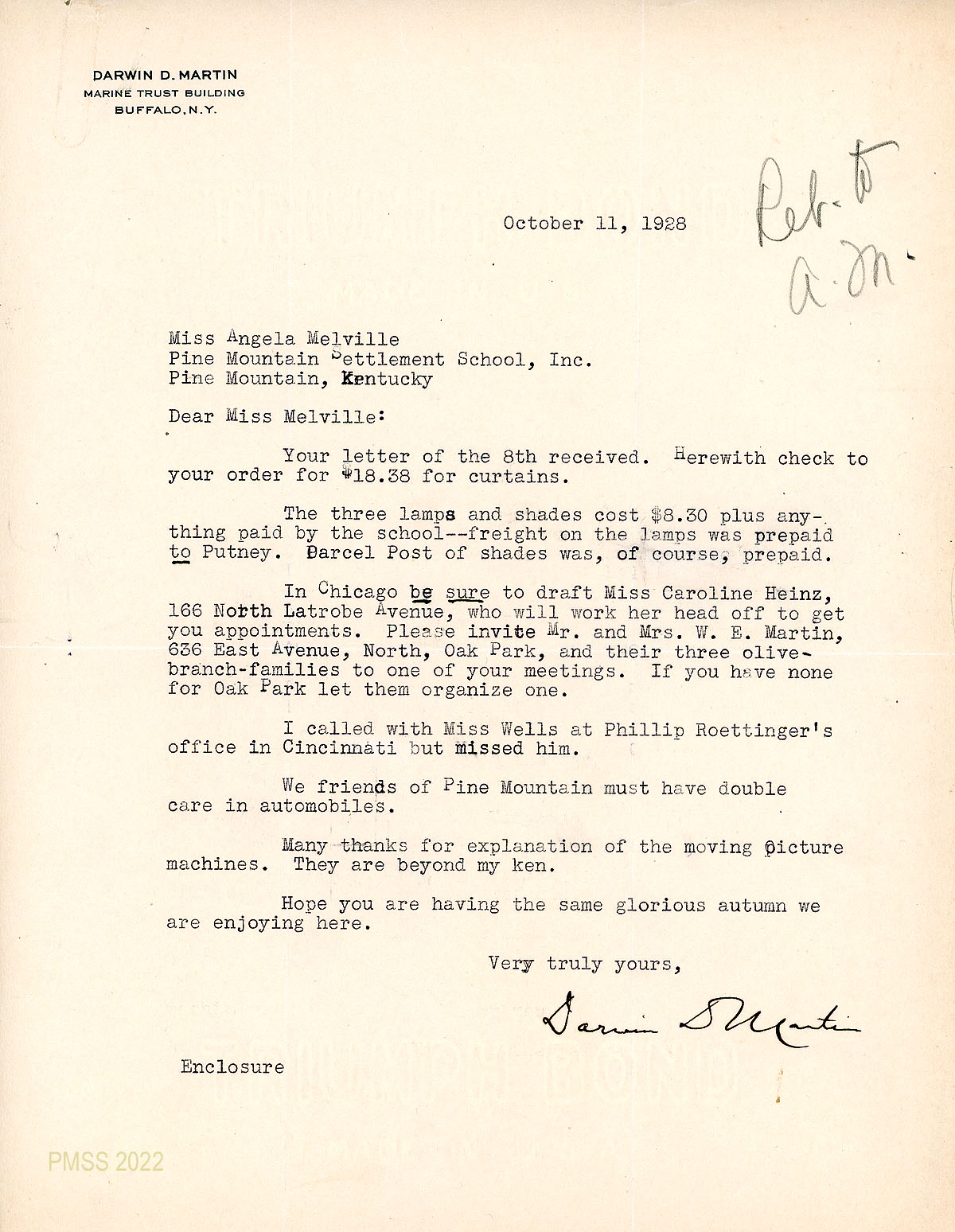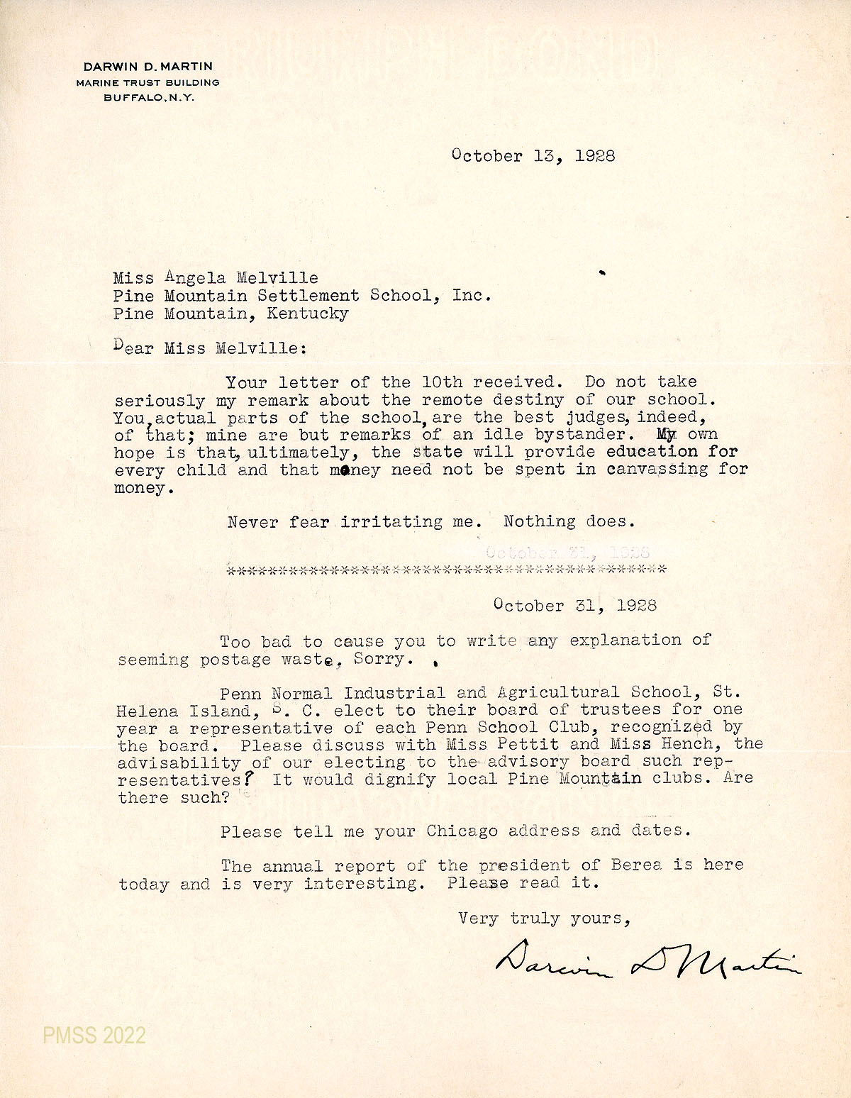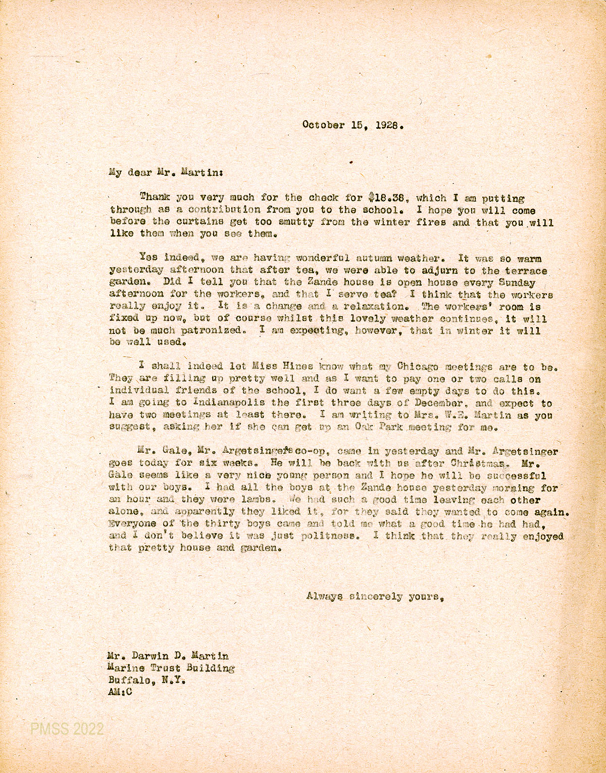 TAGS: Darwin D. Martin 1928 Correspondence, PMSS Board of Trustees, room furnishings from Larkin Company, Delco Light Company, PMSS power house, batteries, Mr. Harshbarger, Katherine Pettit, Kentucky Utilities Company, transmission line, Mr. Samuels, Angela Melville’s fundraising tour, Elizabeth Hench, Delta Sigma Sorority, fire bell, fire extinguishers