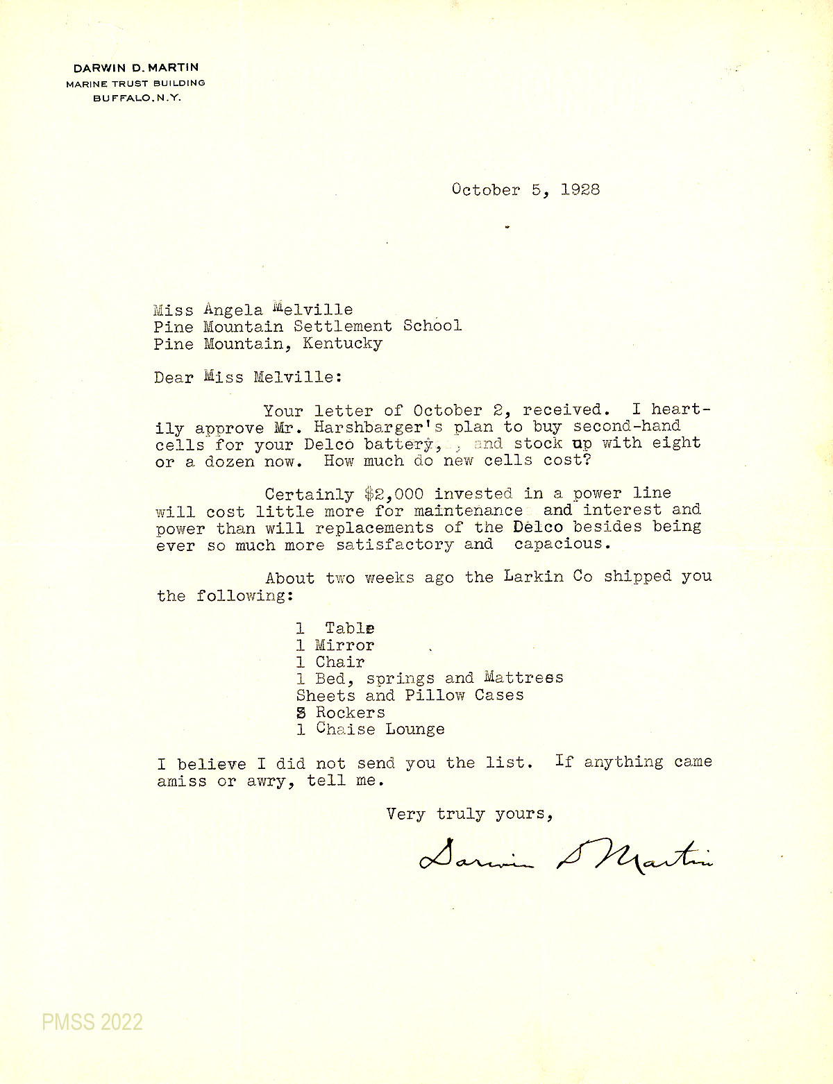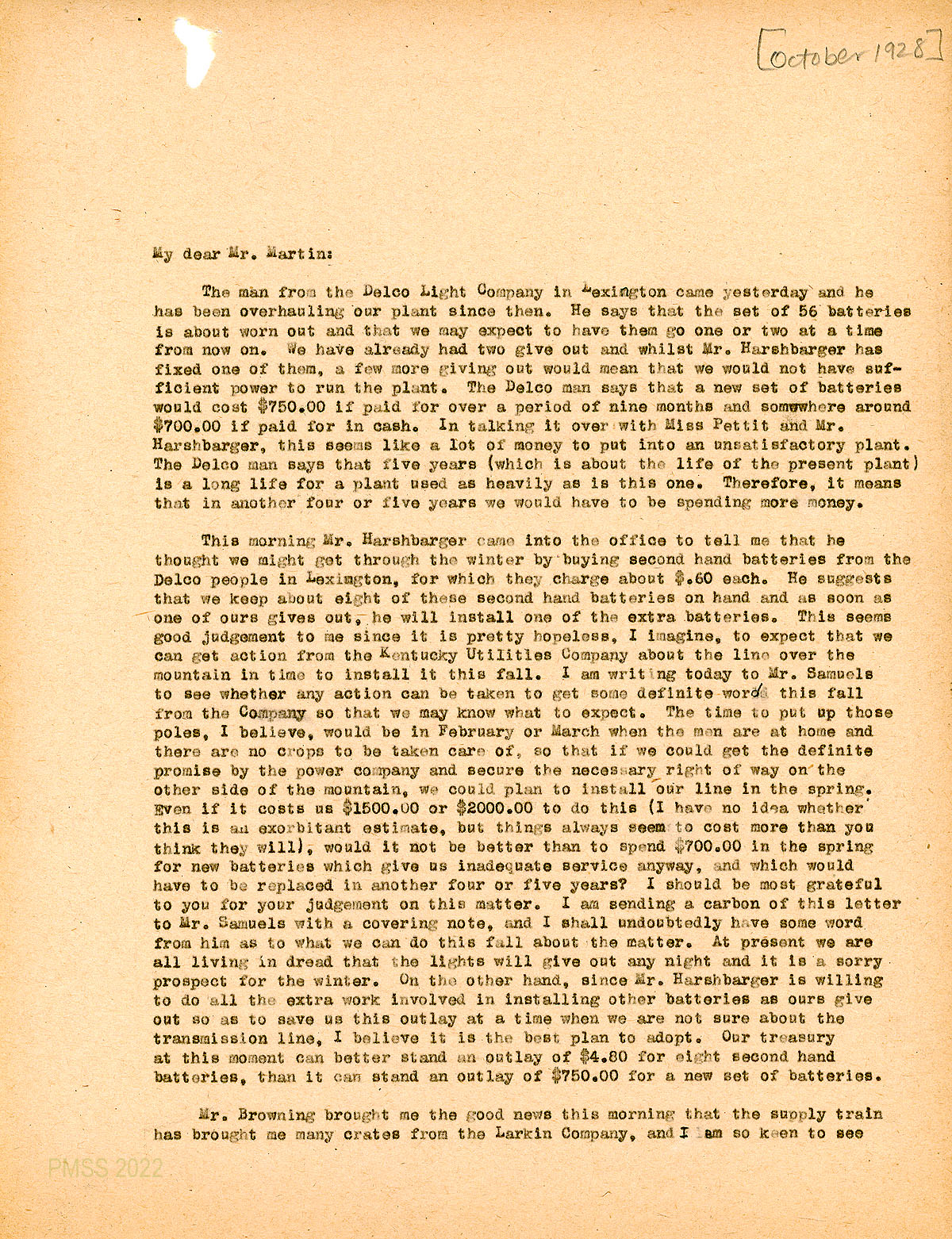 089-089a N.D. [Handwritten notation in top margin: “October 1928”] Two-page letter to Martin from Melville, who tells of the work that an employee from the Delco Light Company is doing to overhaul PMSS’s plant. New batteries are needed but Mr. Harshbarger and Miss Pettit determined that the $700 cost (cash) is too expensive for an “unsatisfactory plant” which will last only 4-5 years. Harshbarger suggests buying second-hand batteries from Delco for 60 cents each and he would replace dead batteries as needed. Also, Melville points out, Kentucky Utilities Company may have a transmission line over the mountain by spring and asks Melville if it would be better to spend over $1000 for the line instead of paying for a new plant. She has sent a copy of this letter to Mr. Samuels, asking what to do this fall. Many crates of furniture from the Larkin Company just arrived on the supply train and she thanks Martin for making it possible.