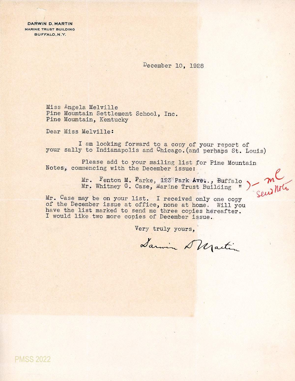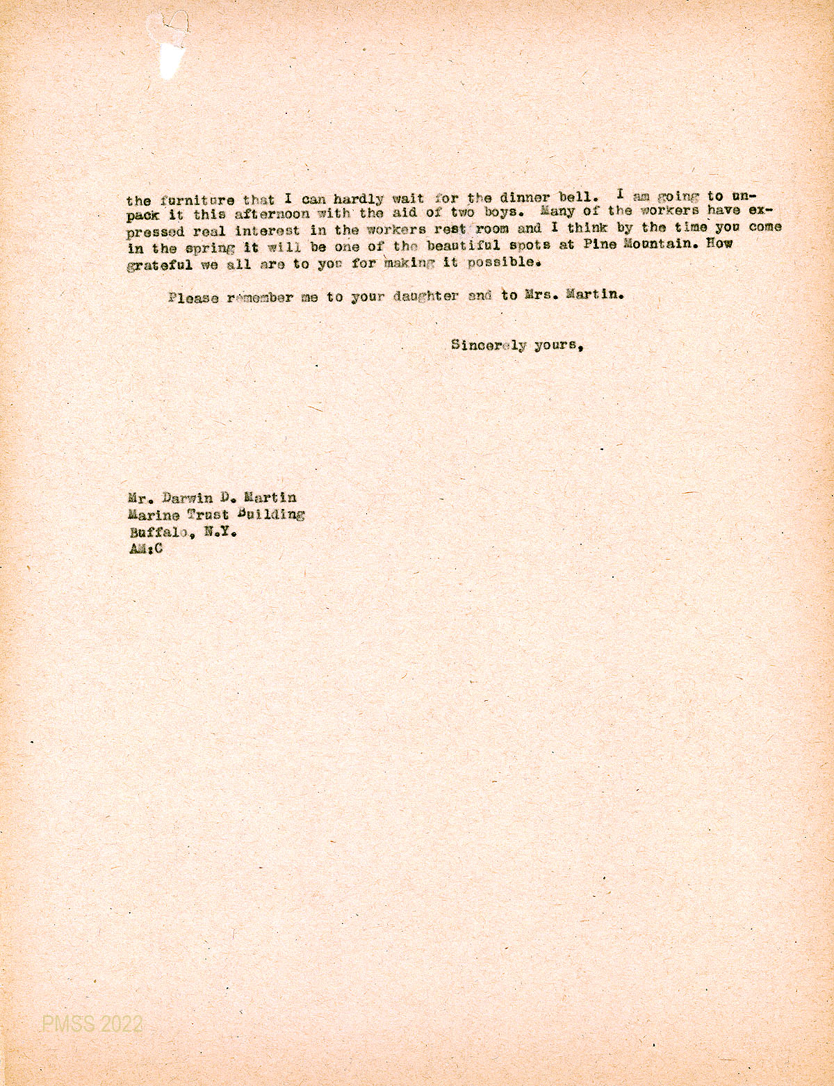 [Note: Letters from PMSS staff in the PMSS Collections are carbon copies, typewritten, unsigned, and meant for the Office files. The original signed documents were sent to the correspondents. The initials at the bottom left of most PMSS letters indicate the writer (along with initials of the secretary). For example, ““KP” refers to Katherine Pettit, and “AM” to Angela Melville. Letters from D.D. Martin are typewritten originals on Larkin Company letterhead or his personal stationary. The following list of contents is in chronological order and not necessarily in the order of the image numbers.]
