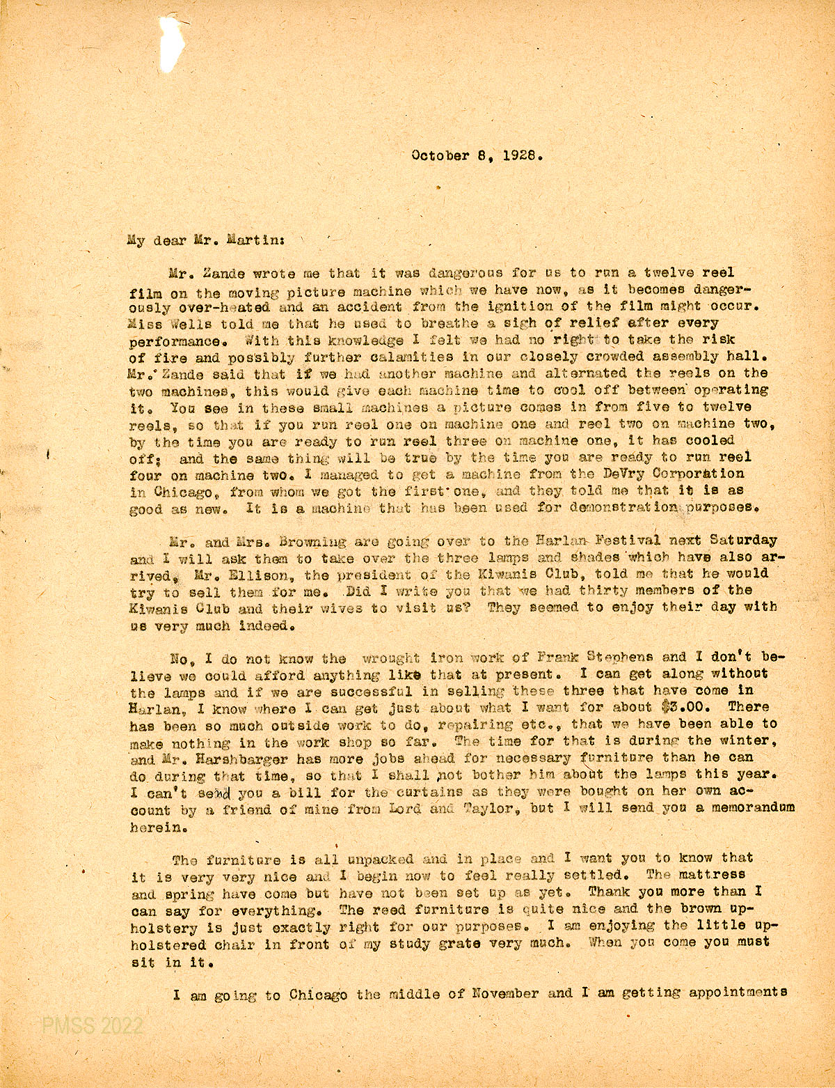 091-091a October 8, 1928. To Martin from AM [Melville], answering his question why PMSS needs two moving picture machines. Mr. and Mrs. [William] Browning will take the “too elaborate” lamps to the Harlan Festival, where Mr. Ellison, president of the Kiwanis Club will try to sell them. Thirty members of the Kiwanis Club and their wives recently visited PMSS. Melville explains to Martin why his suggestions about the lamps were not feasible. She thanks him again for the furniture; tells him she will be in Chicago in November, then Indianapolis, and possibly Cincinnati [to give fundraising talks for PMSS]. She asks if Martin knows Phillip [sic, Philip] Roettinger, whose daughter and her husband were in a fatal car accident, leaving a 10-year-old boy.