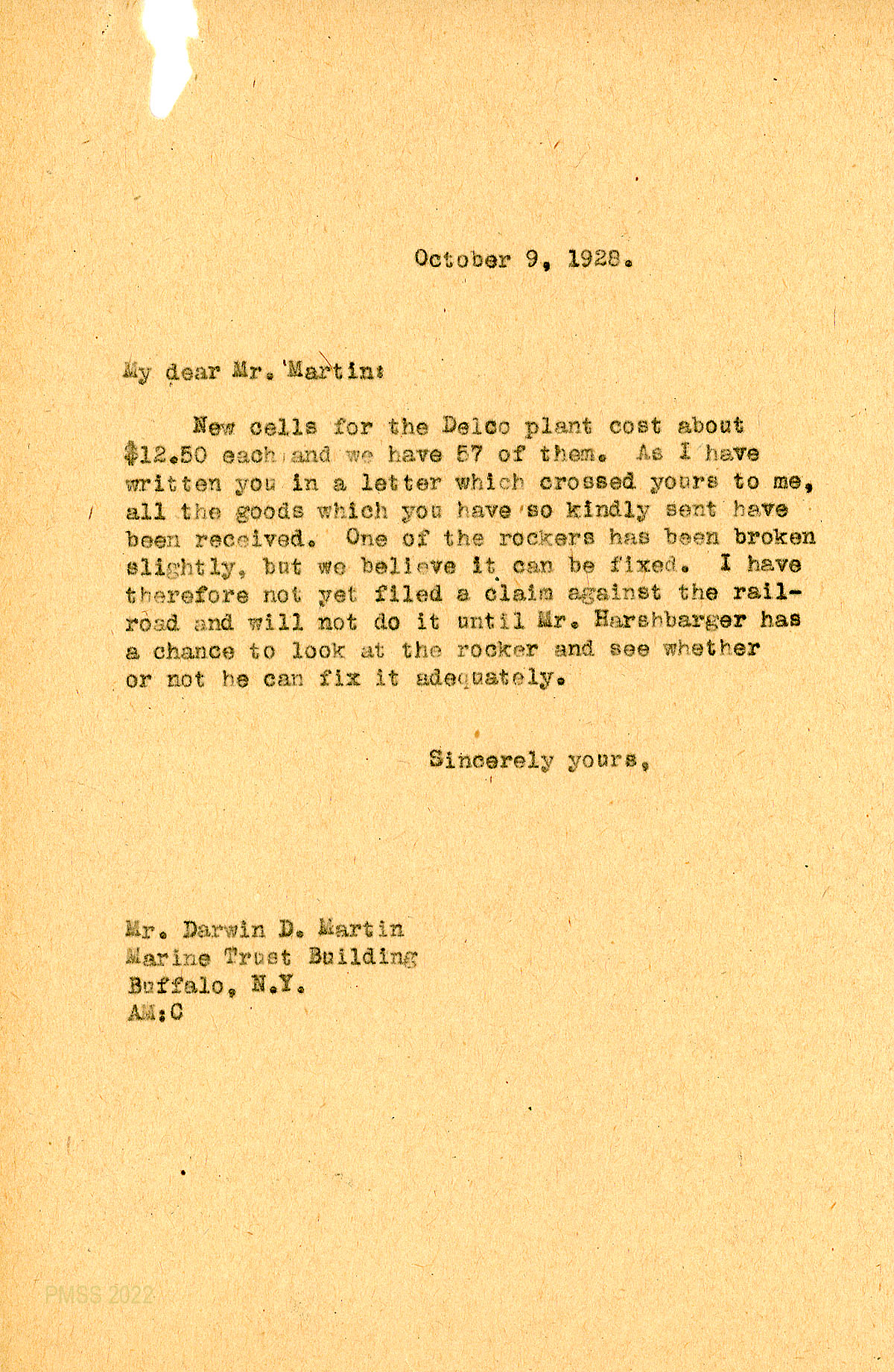 090 October 5, 1928. To Melville from Martin, approving of Mr. Harshbarger’s plan to stock up on second-hand batteries for the Delco plant and asking the cost of new cells. He also agrees to invest in a power line. He lists items that Larkin Co. shipped to PMSS: table, mirror, chair, bet, sheets, rockers, and a chaise lounge.