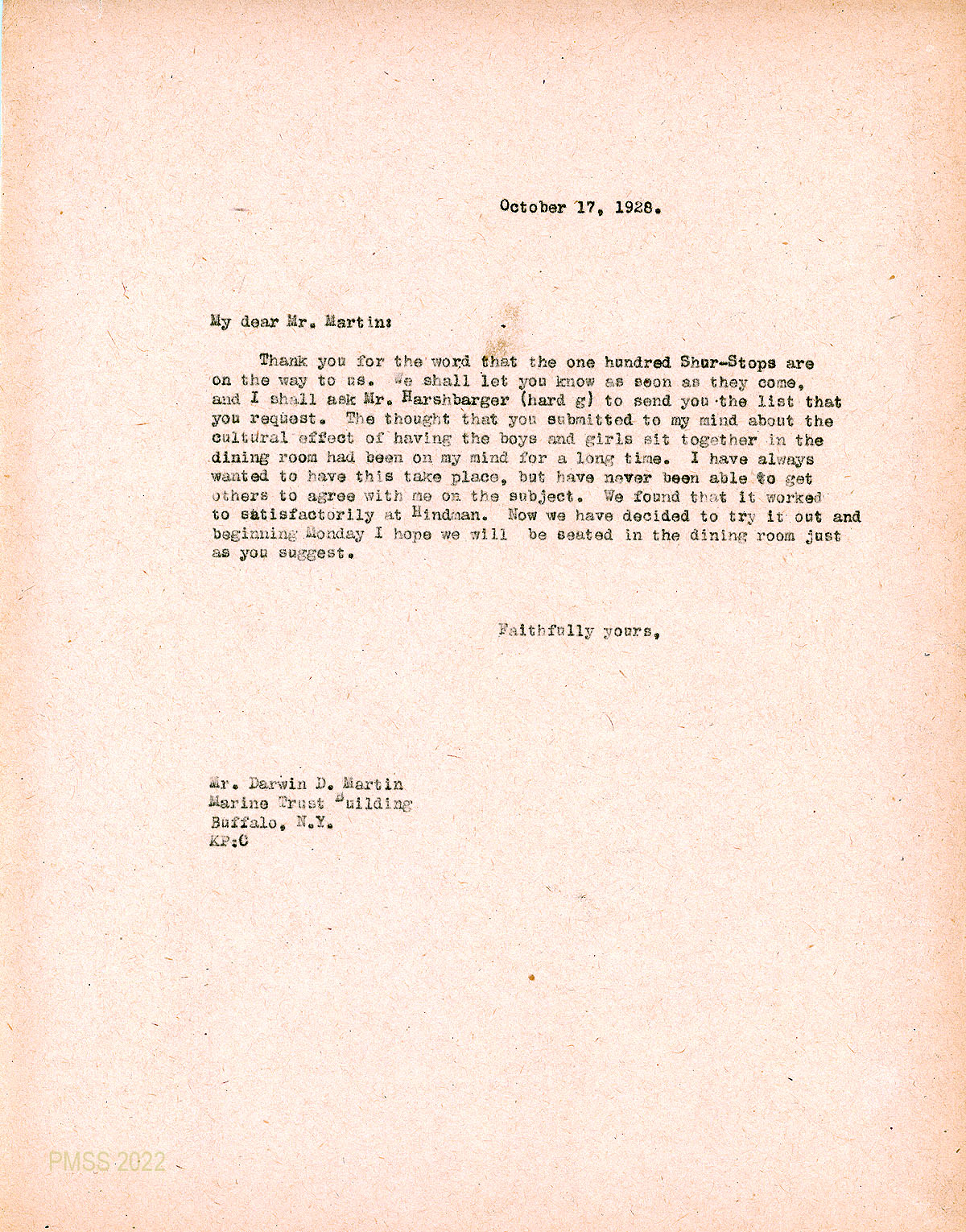 096 October 17, 1928. To Martin from KP [Katherine Pettit], thanking him for sending 100 Shur-Stops [fire extinguishers]. The School has followed his suggestion that, for its “cultural effect,” boys and girls will be sitting together in the dining room.