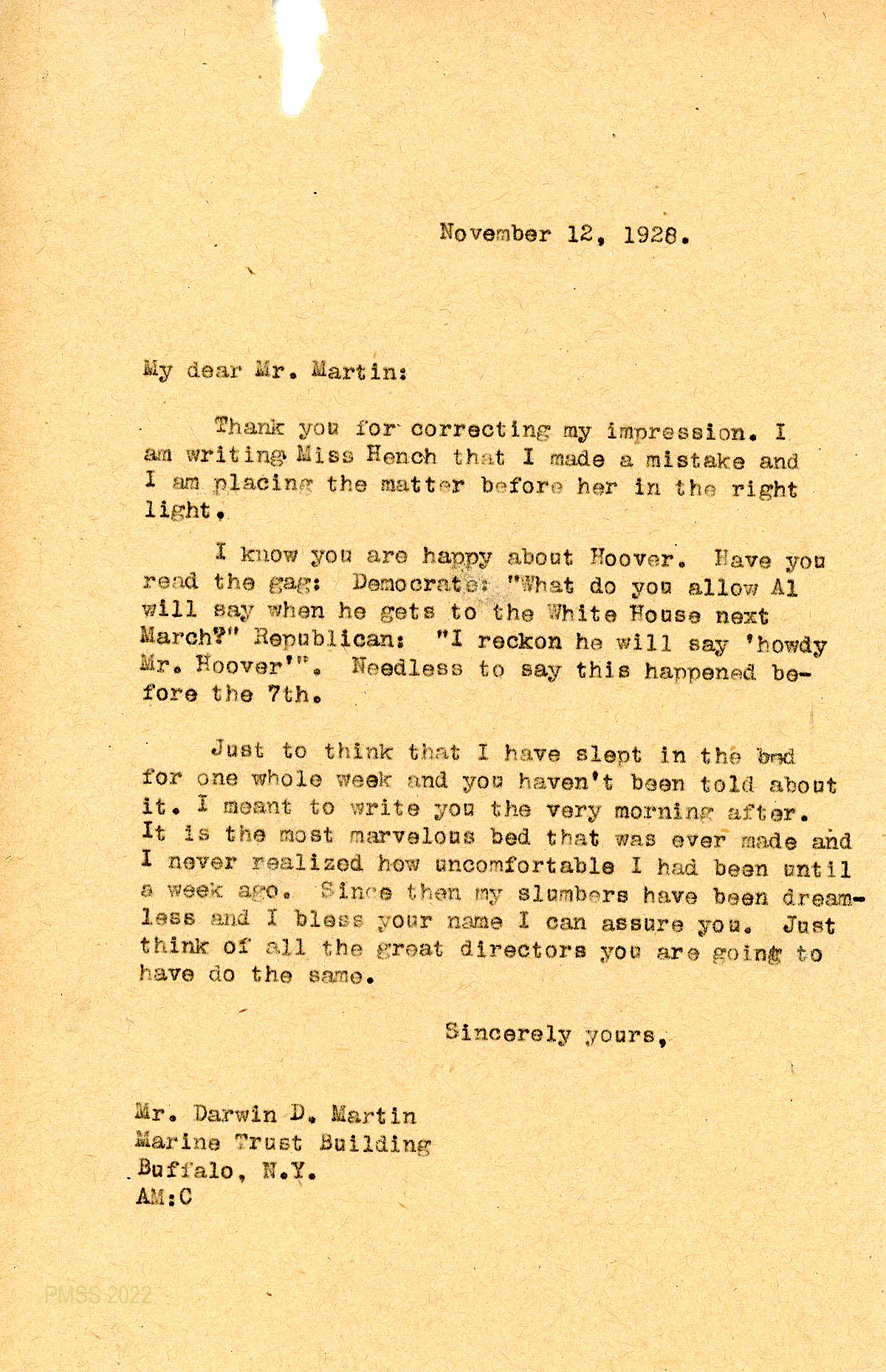 101 November 12, 1928. To Martin from AM [Melville], thanking him for the clarification and for her “marvelous” bed.