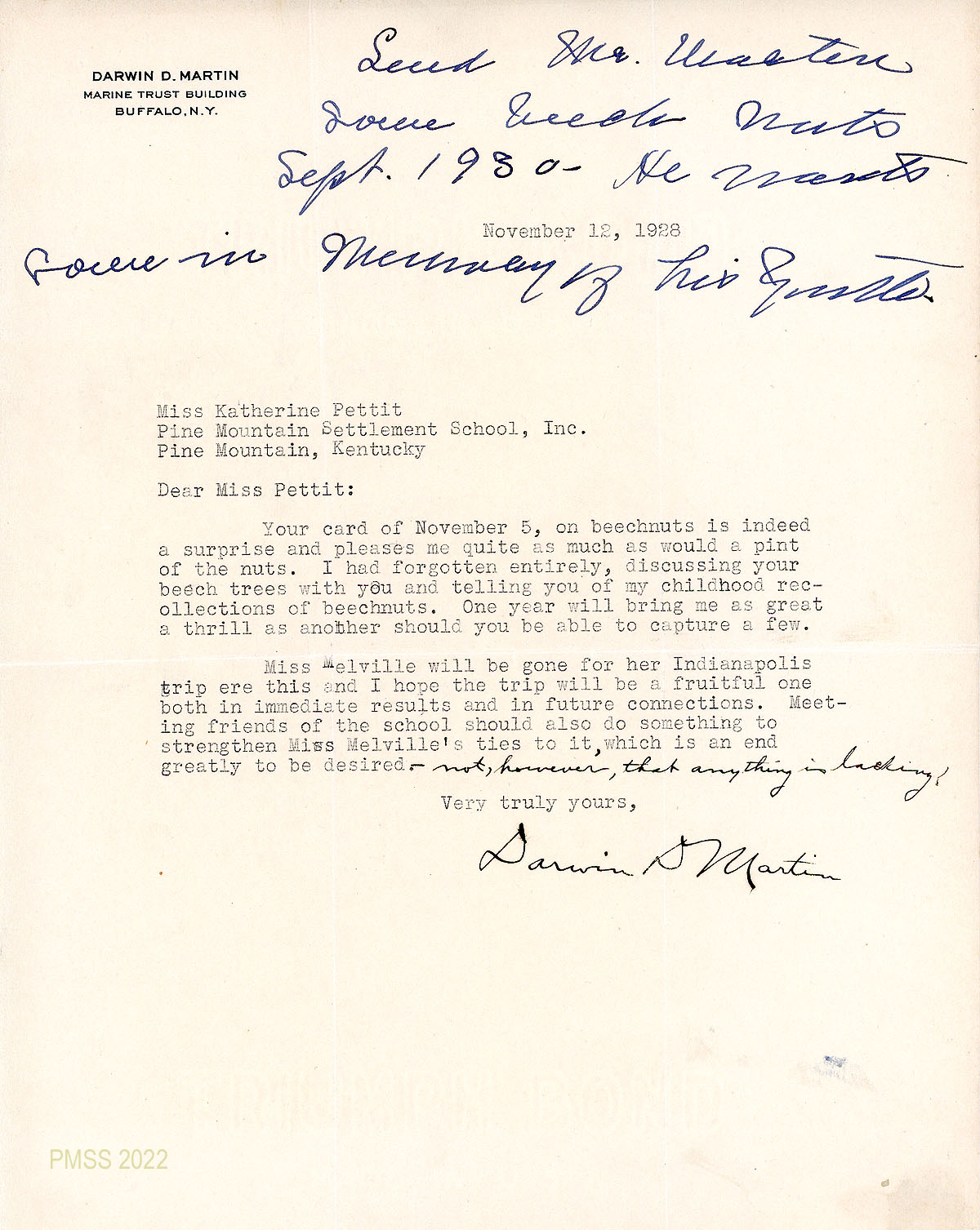 102 November 12, 1928. To Miss Pettit from Martin, thanking her for the card on beech nuts, after discussing with her about his childhood memories of beech nuts. [Notation in Pettit’s handwriting: “Send Mr. Martin some beach nuts Sept. 1920[?] – He wants some in memory of his youth.”]