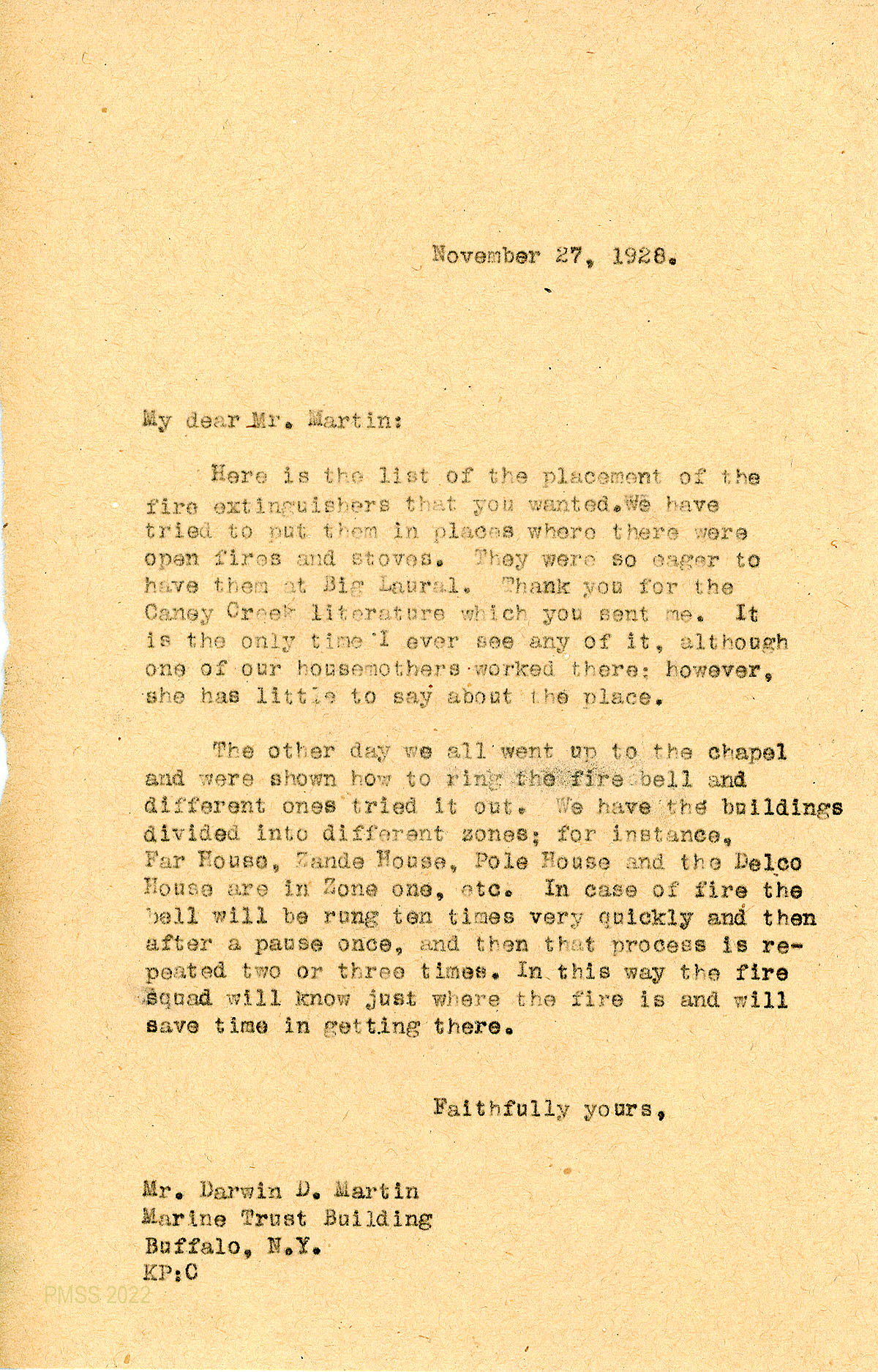 103 November 27, 1928. To Martin from KP [Pettit], sending him a “list of the placement of the fire extinguishers that you wanted.” She thanks him for the Caney Creek literature and describes the use of the fire bell at the School, which will indicate to the “fire squad” the fire’s location.