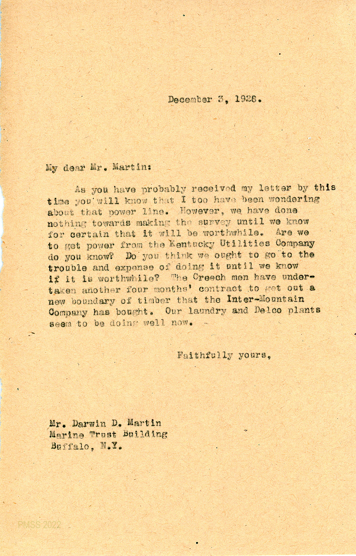 104 December 3, 1928. To Martin from [unsigned], asking whether the School will be getting power from the Kentucky Utilities Company. “The Creech men have undertaken another four months’ contract to get out a new boundary of timber that the Inter-Mountain Company has bought.”