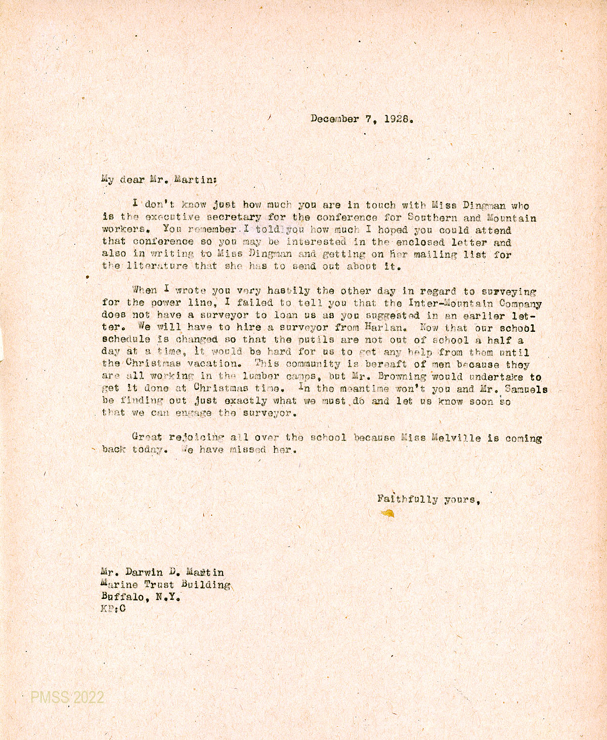 106 December 7, 1928. To Martin from KP [Pettit] enclosing a letter from Miss Dingman, executive secretary for the conference for Southern and Mountain Workers. She suggests that Martin attend the conference, and subscribe to their mailings. About the power line, PMSS will have to hire a surveyor from Harlan because students are in class all day and the community men are all working in the lumber camps. Therefore, no-one is available, except that Mr. Browning could do it at Christmas time. She asks that Martin and Mr. Samuels let her know what to do.