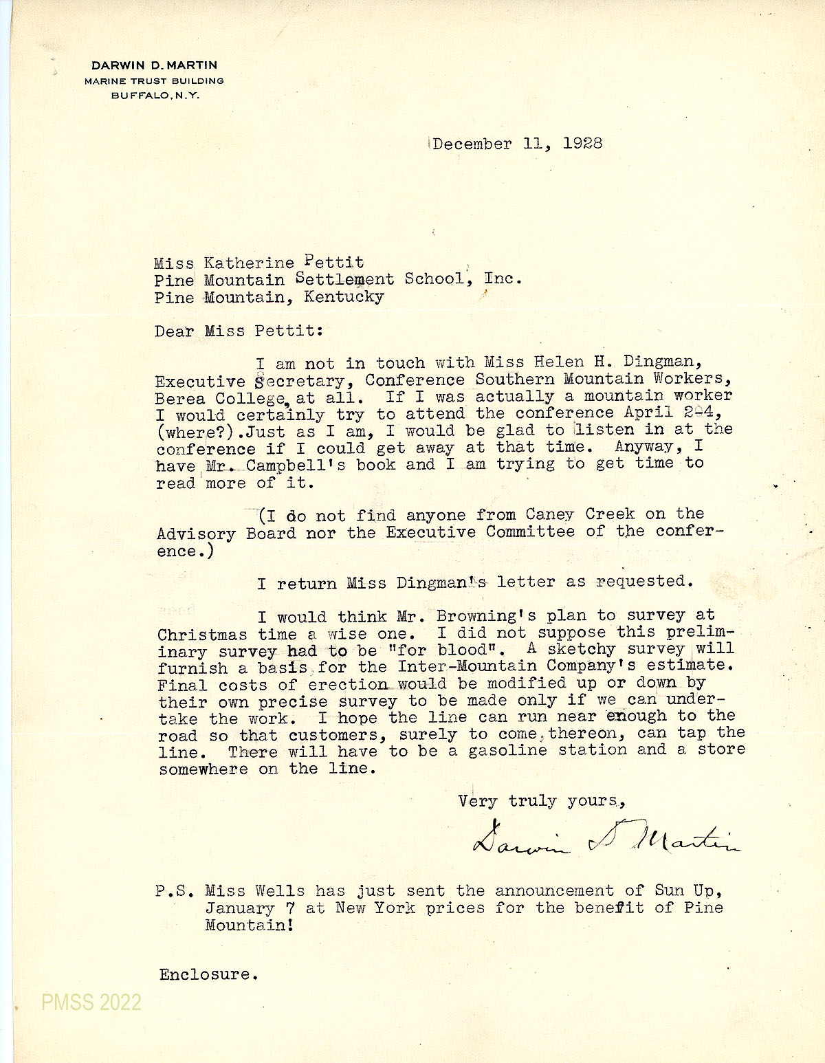 108 December 11, 1928. To Pettit from Martin about whether he will attend the Conference of Southern Mountain Workers. He is reading Mr. Campbell’s book. He observes that there is no-one from Caney Creek on the Advisory Board or the Executive Committee of the conference. He thinks a survey by Mr. Browning would be a wise move as the Inter-Mountain Company will do their own precise survey, “if we can undertake the work.” He states other ideas about the power line. In a postscript, Martin writes that he just received an announcement from Miss Wells of “Sun Up” benefit performance for PMSS on January 7th in New York.