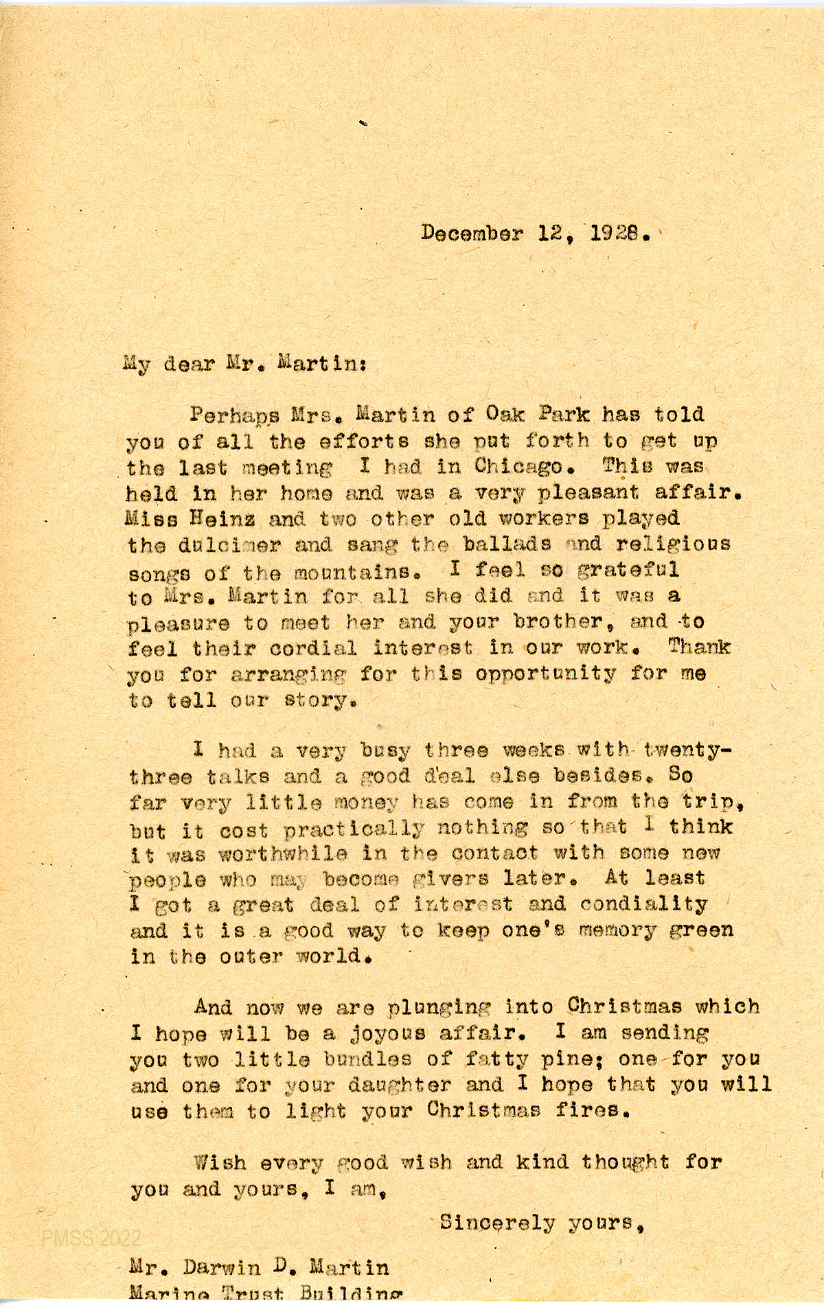 109 December 12, 1928. To Martin from [unsigned, evidently Melville], expressing her gratitude for the help Mrs. Martin of Oak Park gave her Chicago meeting and describes the program that took place in Mrs. Martin’s home, including ballads and religious songs performed by Miss Heinz and two others. The writer did 23 talks in three weeks on the road, which has benefited PMSS (and herself) in several ways: “…[I]t is a good way to keep one’s memory green in the outer world.”