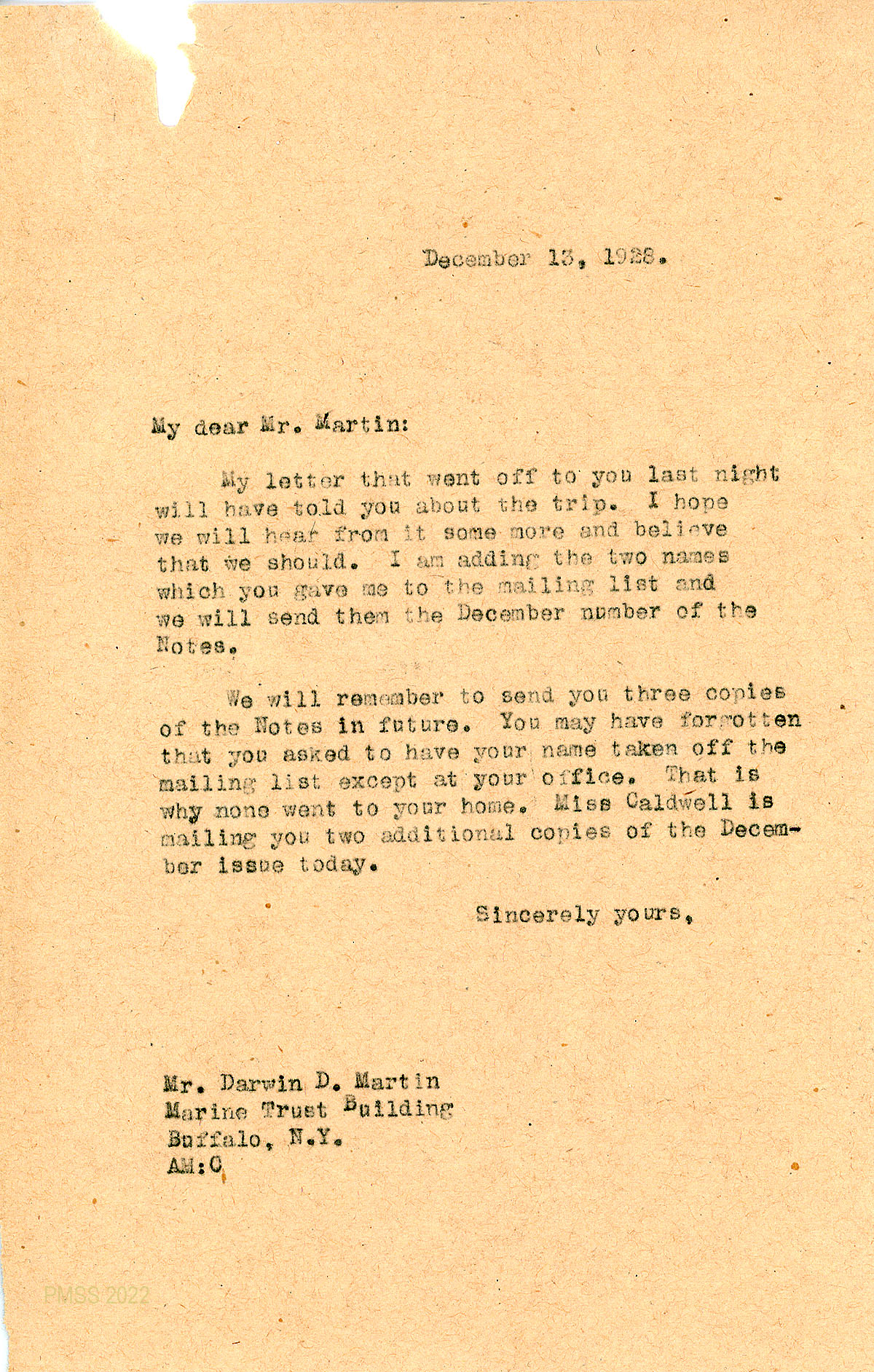 107 December 10, 1928. To Melville from Martin, who is looking forward to a report of her fundraising tour. He provide two names to added to the “Notes” mailing list: Mr. Fenton M. Parke and Mr. Whitney G. Case, both in Buffalo, NY. Martin asks for three copies of each issue in the future.