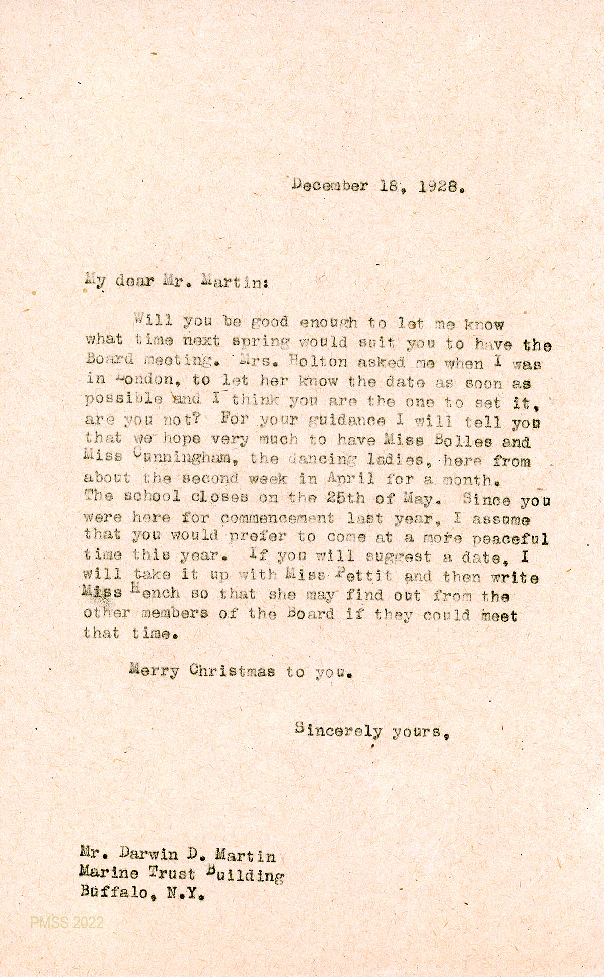111 December 18, 1928. To Martin from [unsigned, evidently Melville], asking him when he would like the Spring board meeting, as Mrs. [Celia Cathcart] Holton would like to know. “[W]e hope very much to have Miss [Dorothy] Bolles and Miss Cunningham, the dancing ladies here…for a month.” When Martin suggests a board meeting date, the writer will tell Pettit and Hench, so they can ask the members if the date is convenient for them.