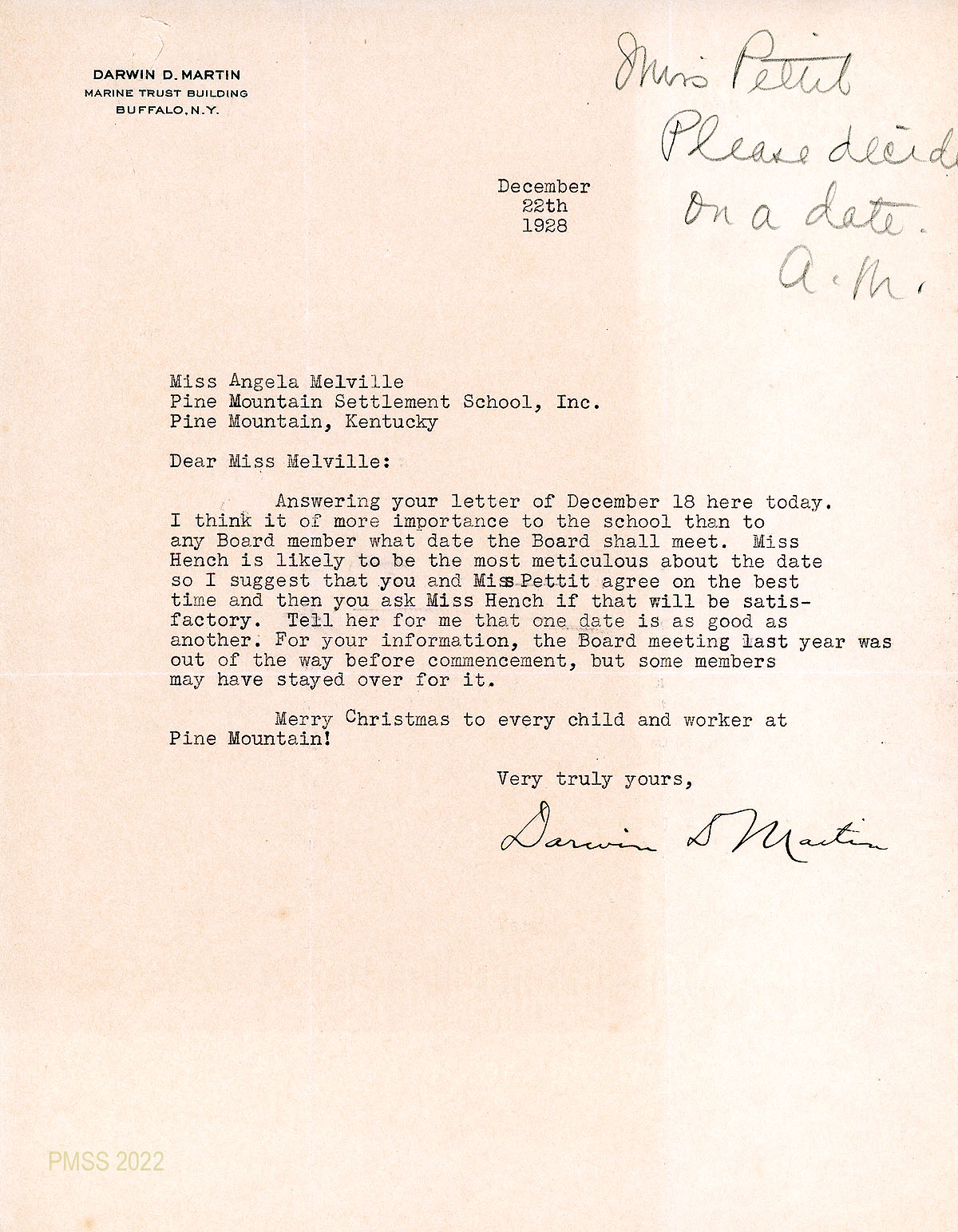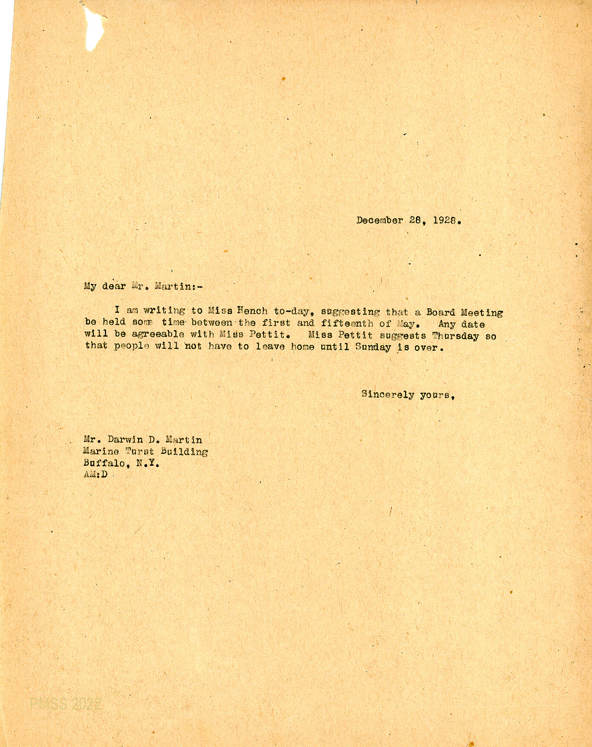 112 December 22, 1928. To Melville from Martin, stating “I think it of more importance to the school than to any Board member what date the Board shall meet.” Therefore, Melville and Pettit should set the date and ask Miss Hench if it is satisfactory. [Notation in right hand upper corner: “Miss Pettit – Please decide on a date. A.M.”