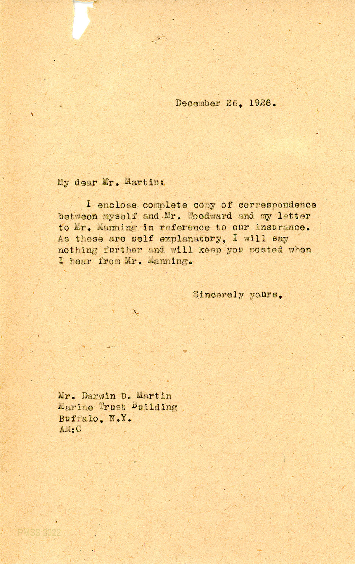 113 December 26, 1928. To Martin from AM [Melville], enclosing copies of correspondence between her and Mr. Woodward and Mr. [Charles N.] Manning about insurance.