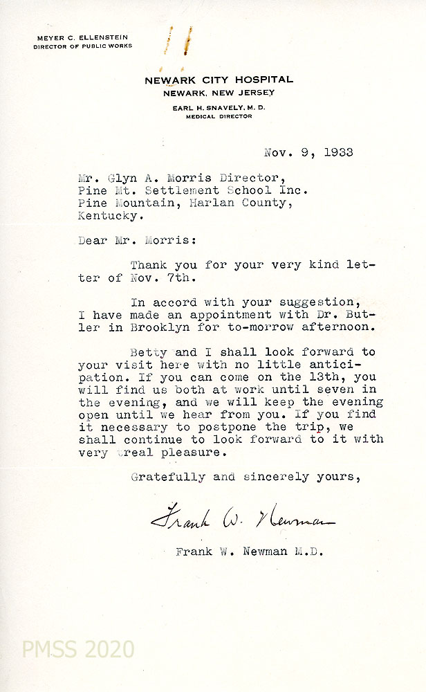 [001], [001a] November 4, 1933. To Glyn Morris, PMSS Director, from Frank W. Newman M.D. on Newark (NJ) City Hospital letterhead, [001] who learned from the Medical Bureau of Chicago that the School was looking for a doctor and asks Morris to consider his letter as his application. He is 28 years old; son of a Presbyterian minister; graduate of Williams College and the College of Physicians and Surgeons of Columbia University in 1931, where he is completing his internship; tells of additional training and his experience; engaged to a nurse. Asks for information about the work at PMSS. [001a] Describes his financial needs.