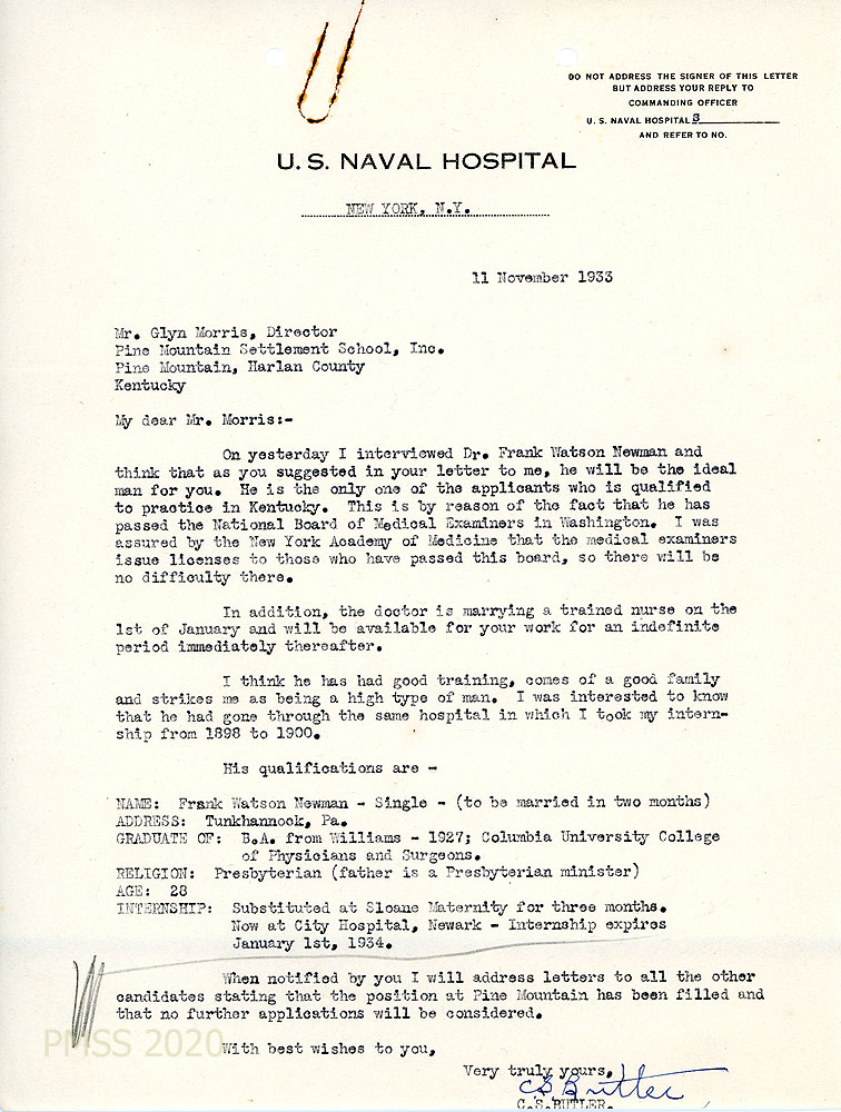 [006] November 11, 1933. To Morris from C.S. Butler, U.S. Naval Hospital, who is sending a report of his interview with “Dr. Frank Watson Newman” and states that “he will be the ideal man for you.” Explains why Newman is qualified to practice in Kentucky; his marriage plans; lists information about Newman’s address (Tunkhannock, PA), schooling, religion, age, internship.