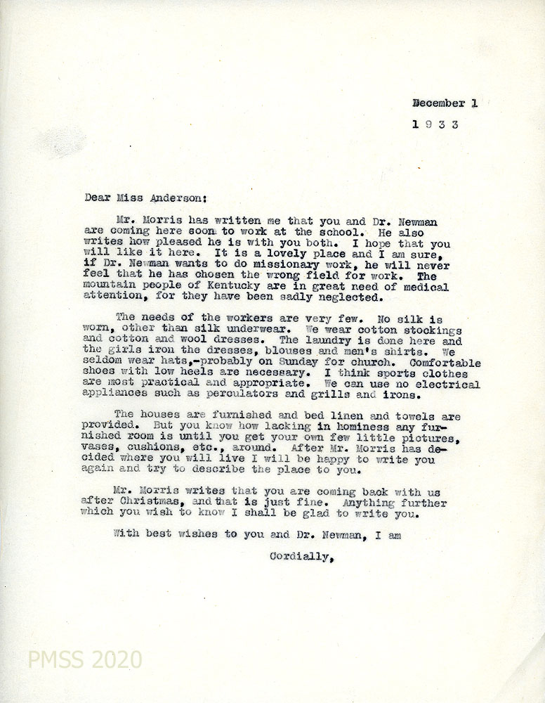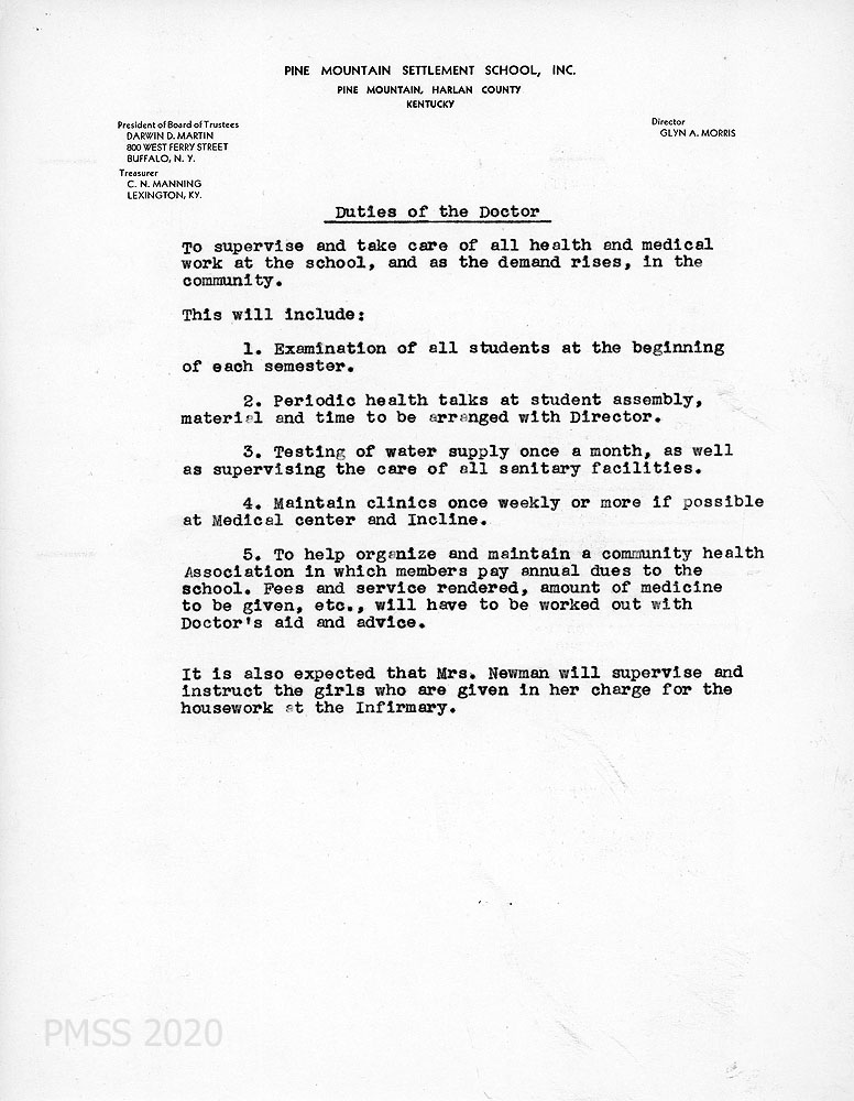 [010], [010a] December 2, 1933. Two-page letter to Newman from [unsigned, likely Morris], [010] confirming his appointment as school and community doctor at PMSS; salary $100 a month and maintenance, increased to $125 after six months if his work is satisfactory; describes what maintenance consists of and vacation and days off. After one year, if acceptable to both sides, he “will be automatically engaged from year to year.” Advises about drugs and instruments in the Infirmary; encloses an outline of his duties; asks his plans to ride to Kentucky with the Morrises. [010a] “I am glad that you have decided to work at Pine Mountain.”