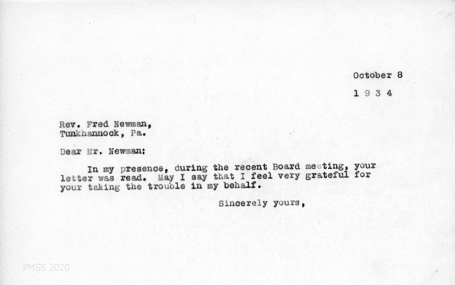 [014] October 8, 1934. To Rev. Fred Newman in Tunkhannock, PA, from [unsigned], thanking him for his letter of support that was read at the Board meeting.