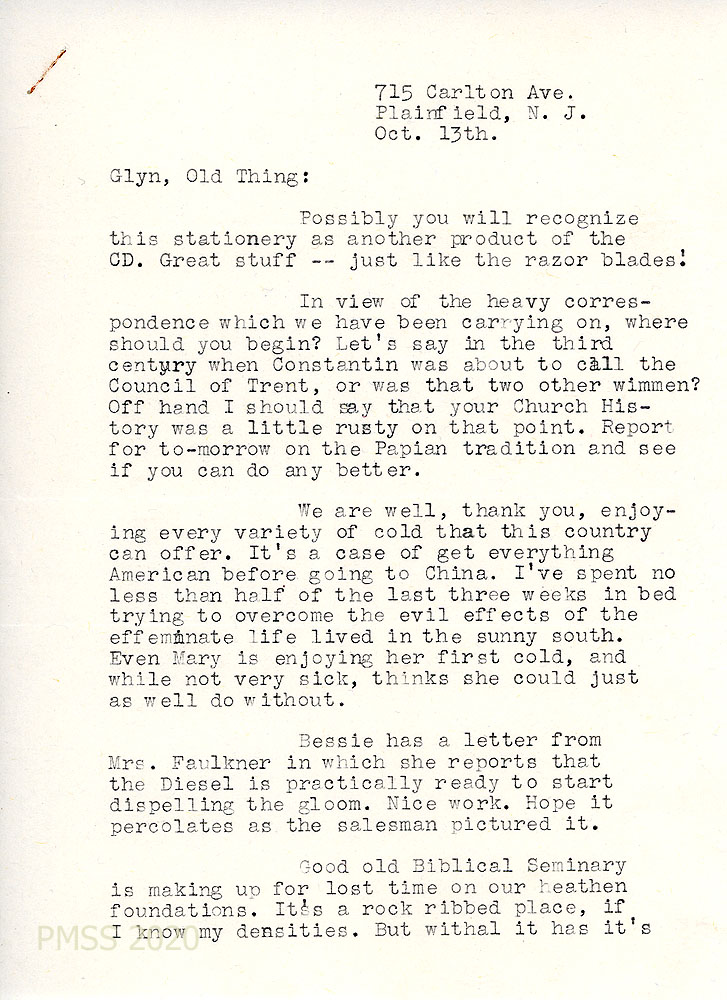 [017], [017a], [017b] October 13, [no year]. Three-page letter to “Glyn, Old Thing” from “Frank” in Plainfield, NJ, [017, page 1] who tells about his and Betty’s health, and that “Bessie” received a letter from Mrs. [Barbara] Faulkner about the Diesel. [017a, page 2] Describes his courses in religion; a Princeton-Williams game he attended. He and Bessie think of Morris daily. [017b, page 3] Expresses his admiration for Morris’s work. Writes about “Mary’s” progress (his baby daughter). Heard from Oscar [Kneller] who “could now read a fair amount a day with the help of a glass. He was also much elated over the small income” from an insurance policy until he is able to work. Fondly remembers [Arthur W.] Dodd, Wilson, the Faulkners, Miss [Alice] Cobb, etc.