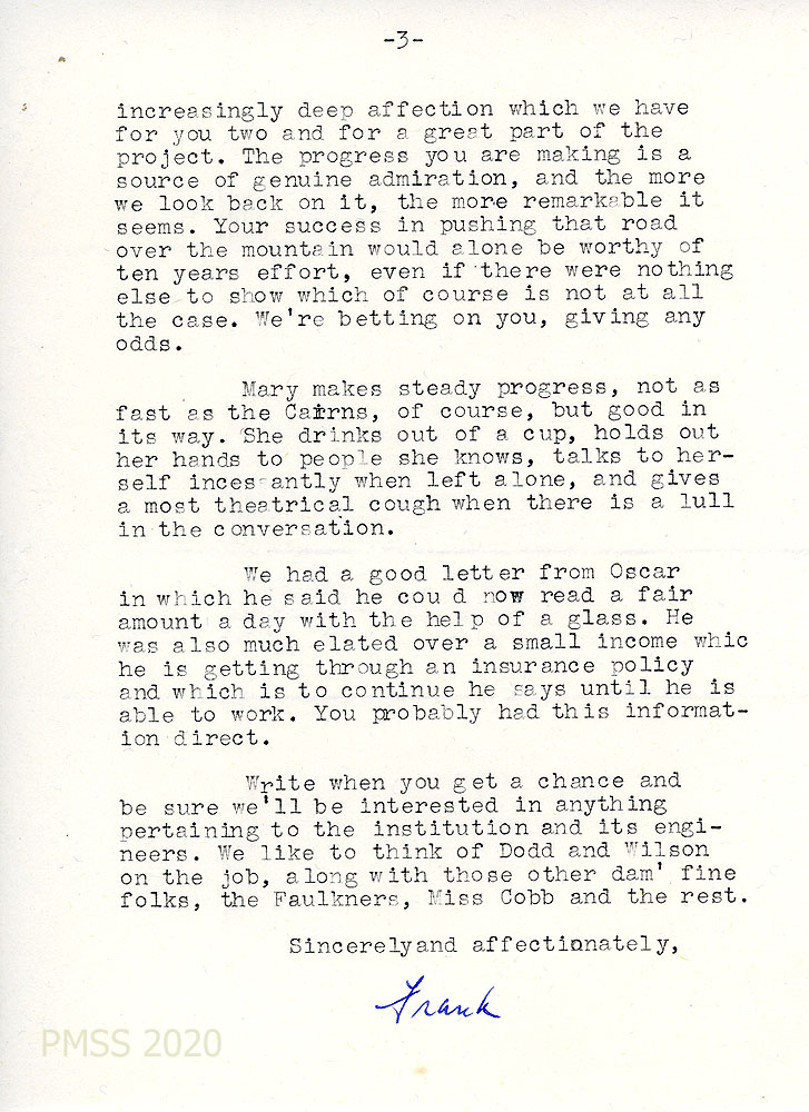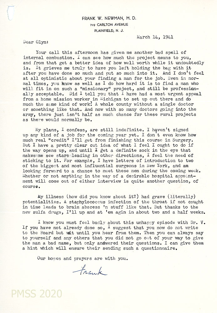 [033] March 14, 1941. To Glyn from Frank, who empathizes with Morris’s problems finding a doctor for PMSS; says his plans are still indefinite but he’s sending letters of introduction to two important New York surgeons, asking for meetings with them. Gives advice on how to handle the aftermath of an episode with Dr. Van Kolken.