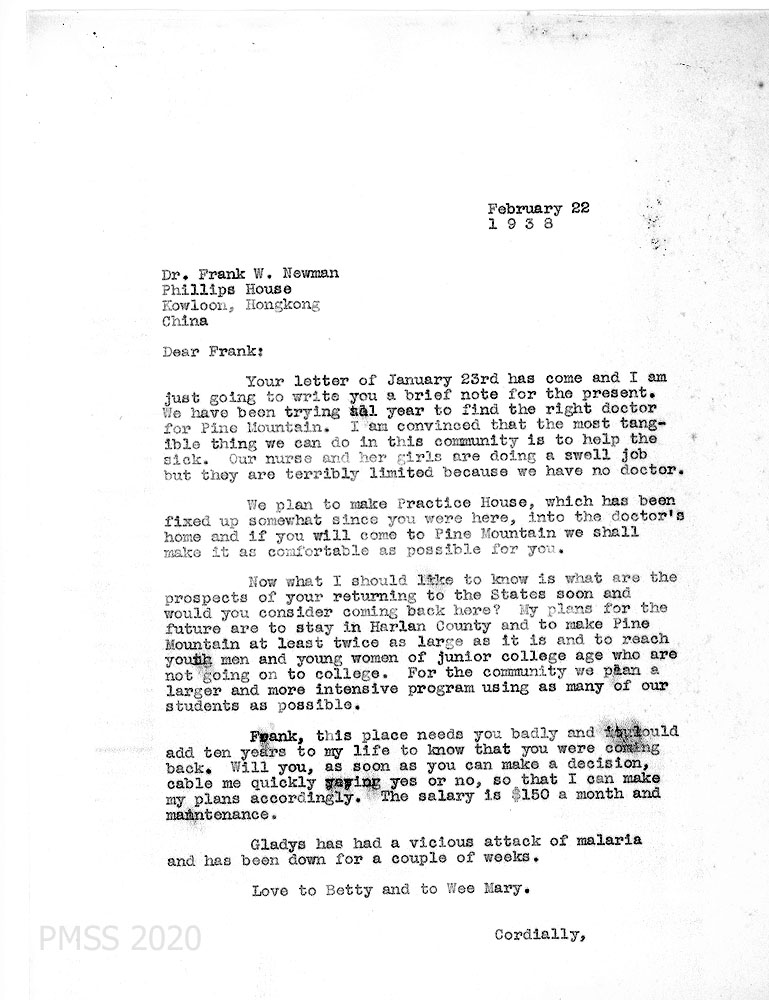 [021] February 22, 1938. To Frank from [unsigned, likely Morris]. “We have been trying all year to find the right doctor for Pine Mountain. I am convinced that the most tangible thing we can do in this community is to help the sick. Our nurse and her girls are doing a swell job but they are terribly limited because we have no doctor.” The School is changing Practice House into the doctor’s home. Asks about the possibility of Newman returning to the U.S. and coming back to PMSS. “My plans for the future are to stay in Harlan County and to make Pine Mountain at least twice as large as it is and to reach young men and young women of junior college age who are not going on to college. For the community we plan a larger and more intensive program using as many of our students as possible.” Gladys has had “a vicious attack of malaria…” Sends his love to Betty and Wee Mary.