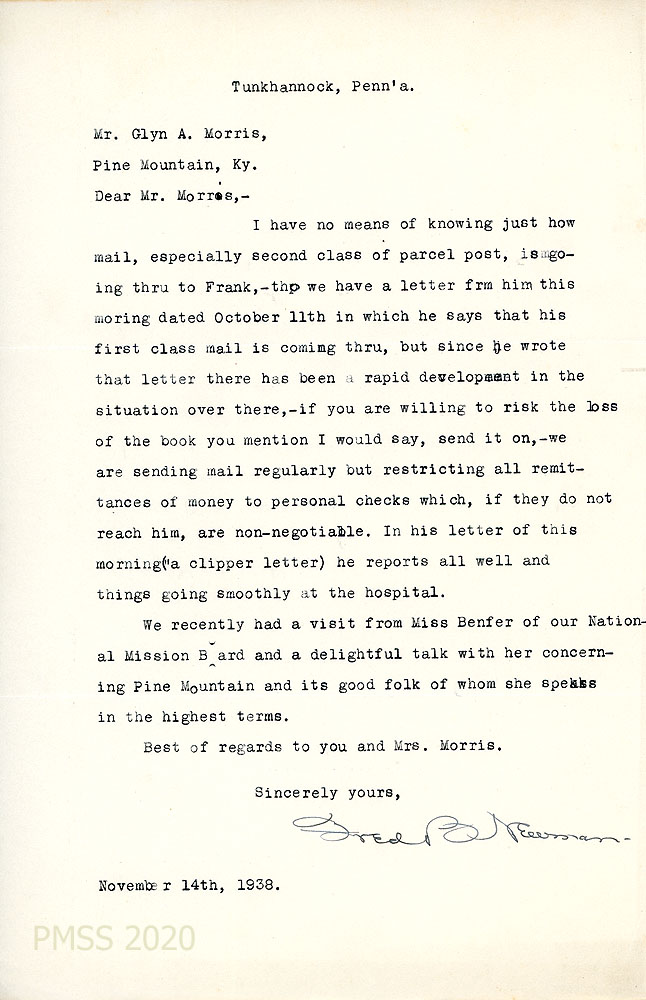 [023] November 14, 1938. To Morris from Fred B. Newman in Tunkhannock, PA, who suggests sending the book to Frank that Morris mentioned, writing that his letters are getting through despite the “situation over there.” Miss Benfer of the National Mission Board visited and they talked about PMSS “and its good folk of whom she speaks in the highest terms.”