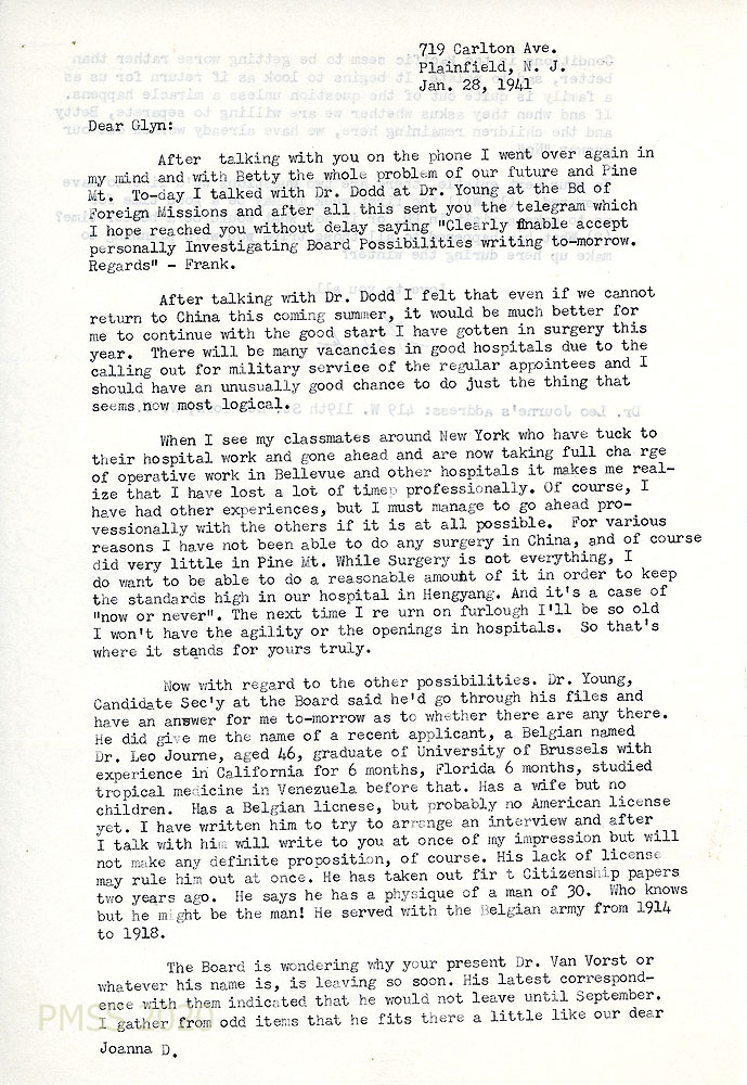 [028], [028a] January 28, 1941. Two-page letter to Glyn from Frank, [028] who discussed his future and PMSS with Betty and Dr. Dodd and Dr. Young at the Board of Foreign Mission; decided to stay with surgery since “there will be many vacancies in good hospitals due to the calling out for military service of the regular appointees….” Explains additional reasons for his decision. Tells of his attempts to find an applicant for PMSS. The Board wonders why Dr. Van [?] has left early. [028a] “Conditions in the Pacific seem to be getting worse….” Asks when he can visit PMSS and why Morris hasn’t visited him in NY.