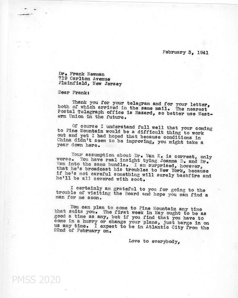 [030] February 3, 1941. To Frank from [unsigned, likely Morris], who understands his decision about not coming to PMSS; mentions Dr. Van K[olken] and Joanna D.; grateful that Newman is helping find a doctor for PMSS; welcomes him to Pine Mountain any time.