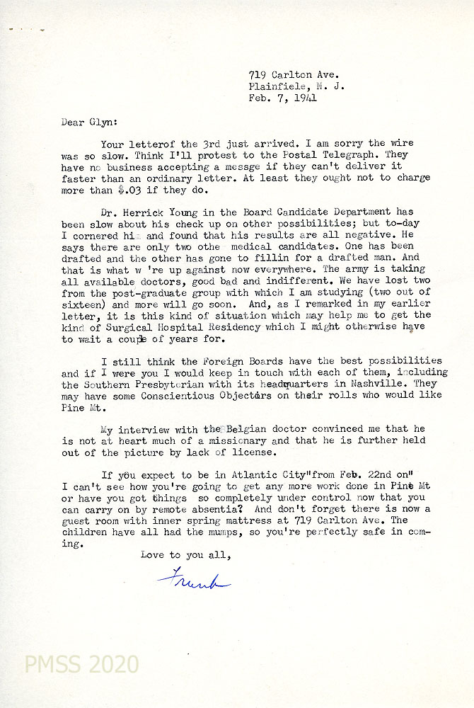 [031] February 7, 1941. To Glyn from Frank. The Board Candidate Dept. has not found any medical candidates for PMSS. “The army is taking all available doctors….it is this kind of situation which may help me to get the kind of Surgical Hospital Residence which I might otherwise have to wait a couple of years for.” Suggests staying in touch with the Foreign Boards for the best possible candidates, including the Southern Presbyterian in Nashville, who may have some Conscientious Objectors on their rolls.