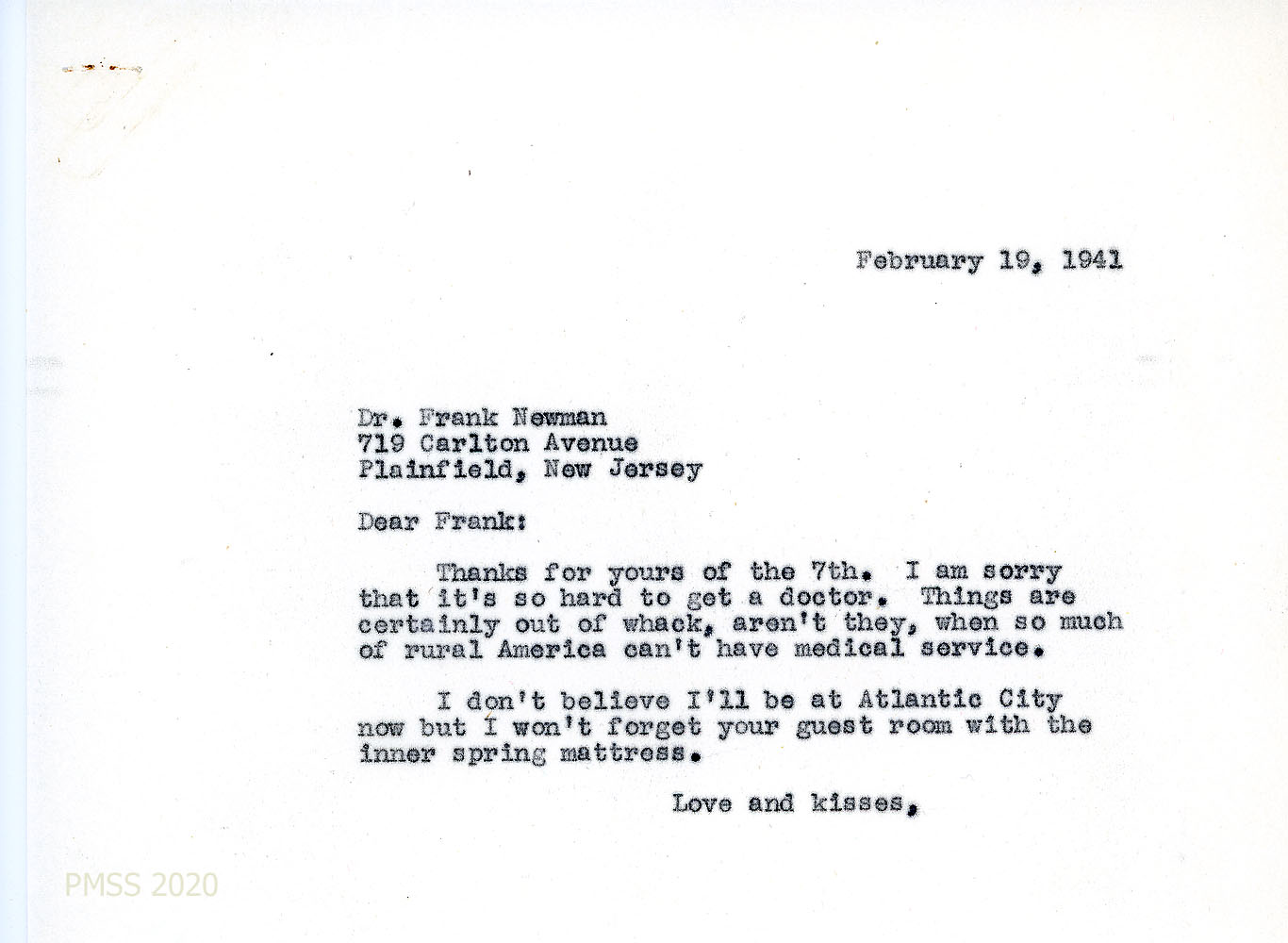 [032] February 19, 1941. To Newman from [unsigned, likely Morris], who regrets that “Things are certainly out of whack…when so much of rural America can’t have medical service.”