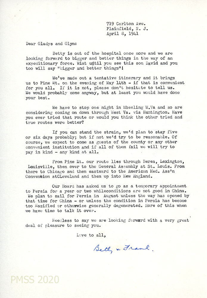[035] April 8, 1941. To Gladys and Glyn from Frank and Betty, who have a new son, David. Provides plans for their PMSS visit in May. The Board is sending the Newmans on a temporary appointment in Persia for a year or two if China’s conditions remain bad.